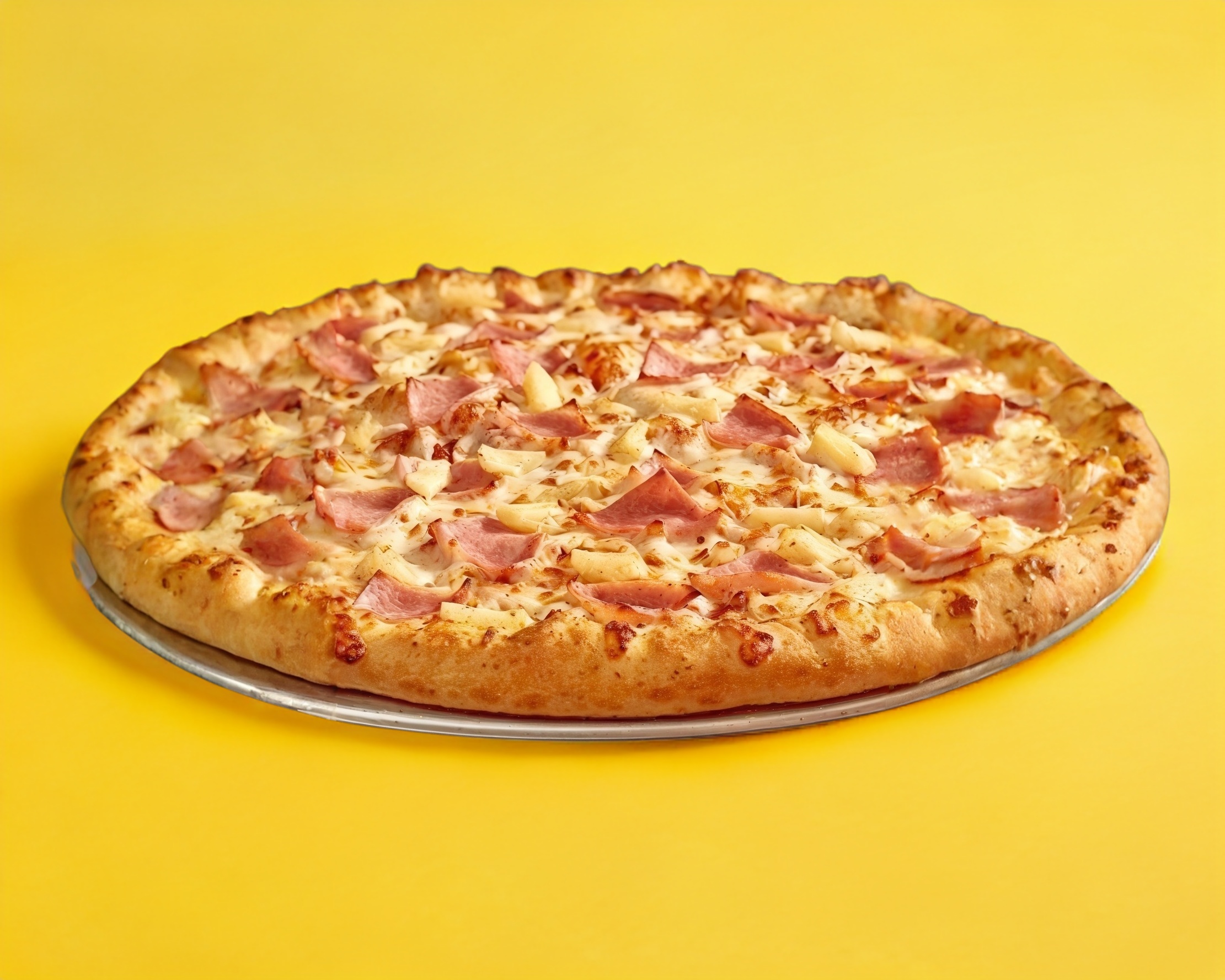 Pasta de tomate, queso mozarella, jamon de pavo y trocitos de piña