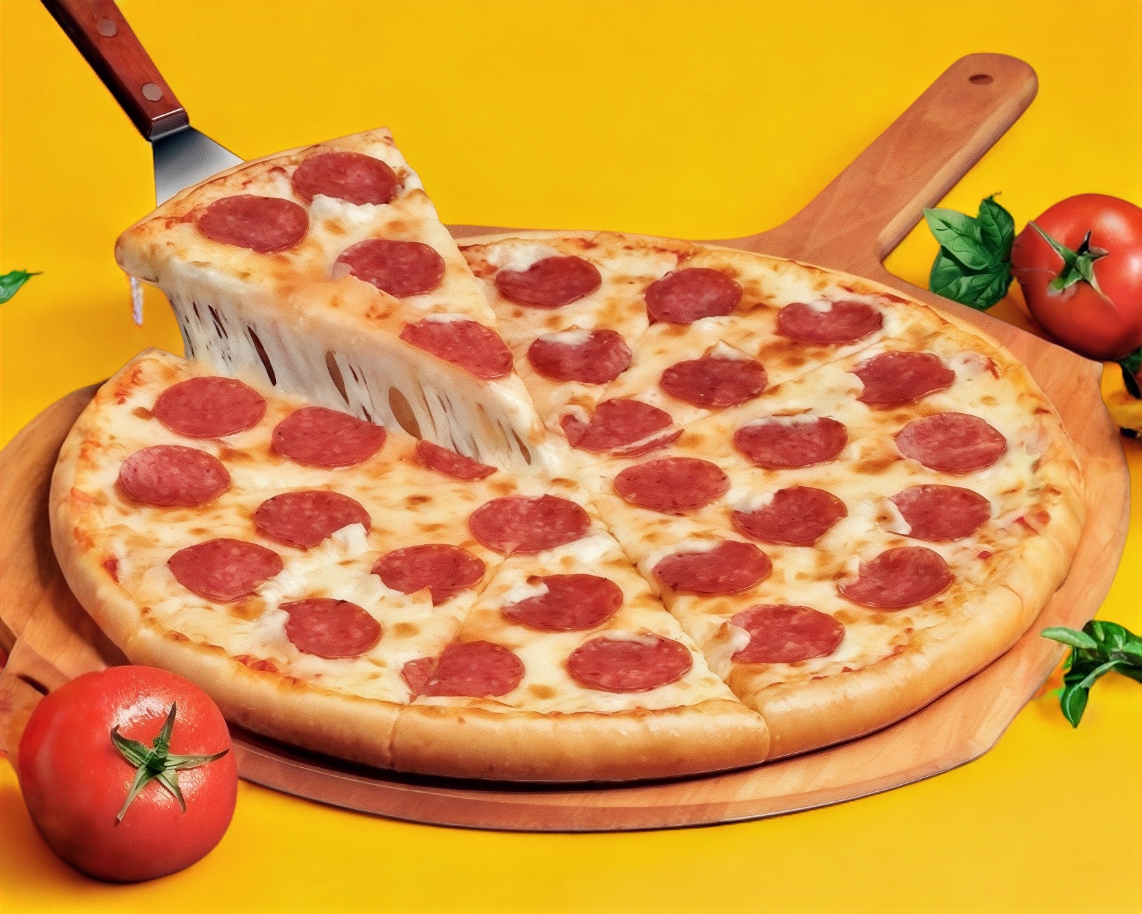 Pasta de tomate, queso mozarella, pepperoni, aceituna negra, chorizo y chile morron