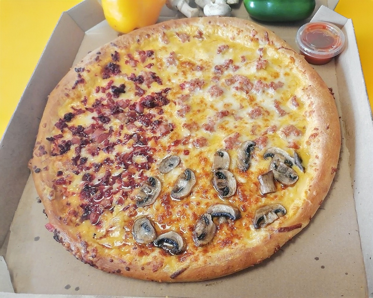 base de crama de queso amarillo,queso mozzarella,champiñones,tocino y chile jalapeño.