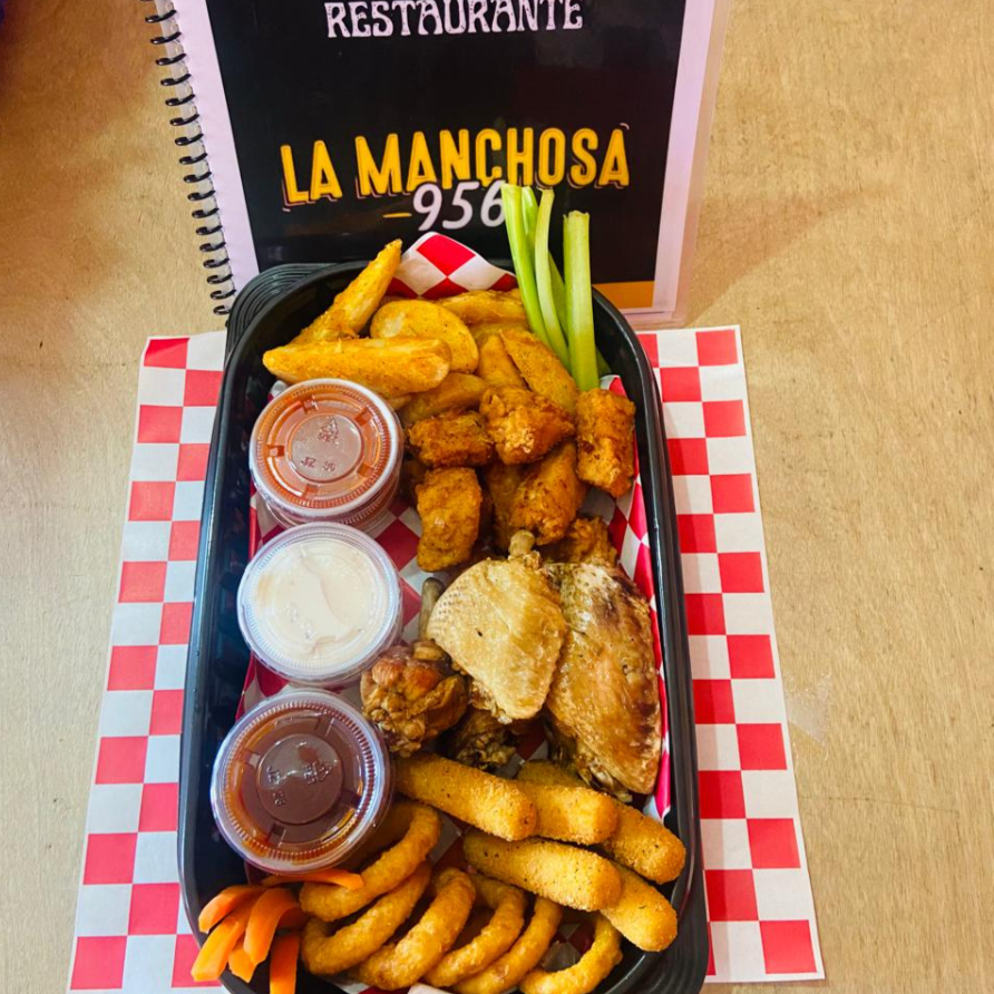 BONELESS 1 KG, ALITAS 1 KG., 6 AROS DE CEBOLLA, 5 DEDOS DE QUESO, NACHOS Y PAPAS