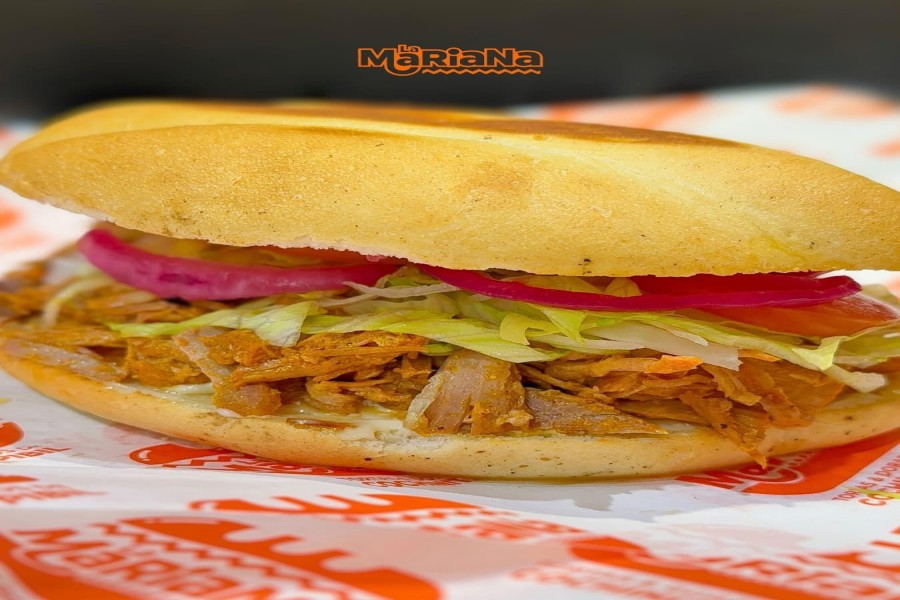 TORTA DE COCHINITA PIBIL CON LECHUGA, TOMATE, CEBOLLA Y MAYONESA