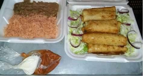 5 chimichangas de queso Monterrey y carne con arroz y frijoles.