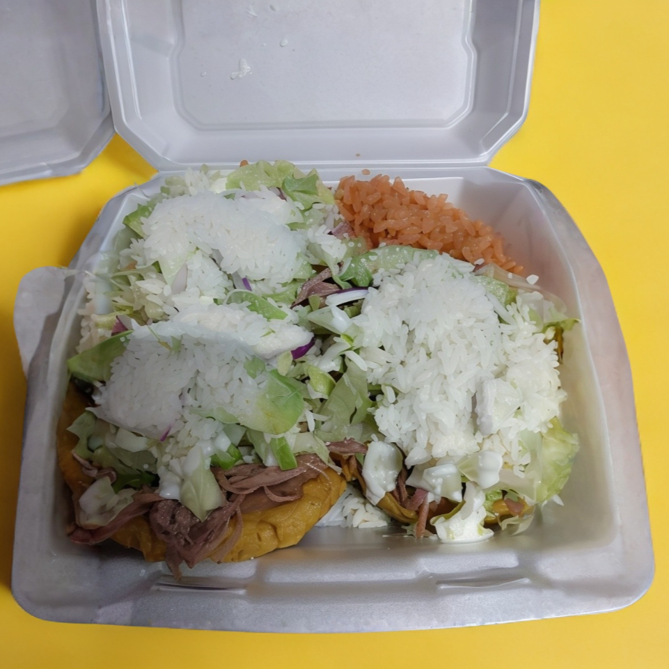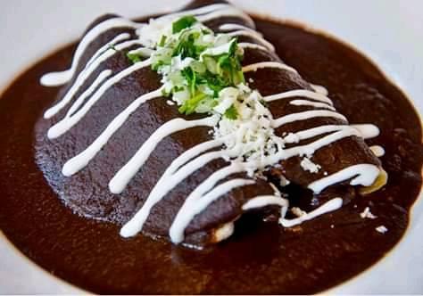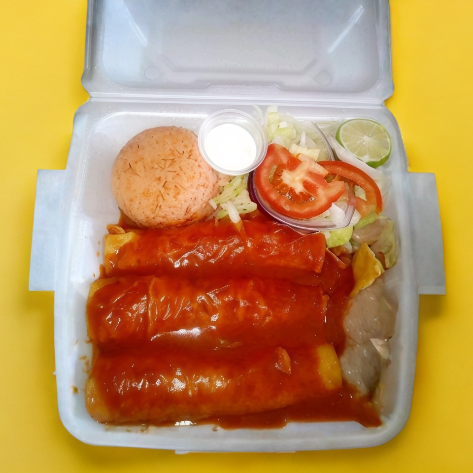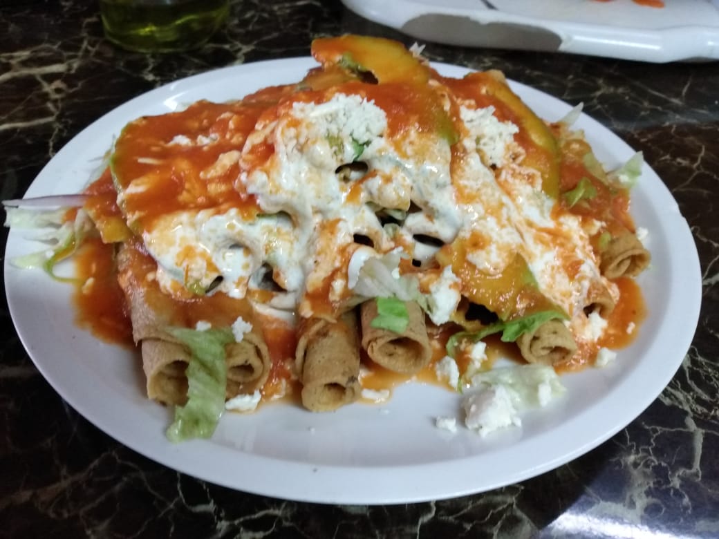 Tres tortillas rellenas de carne deshebrada, acompañadas de arroz y frijoles bañados de crema y queso y consomé aparte.