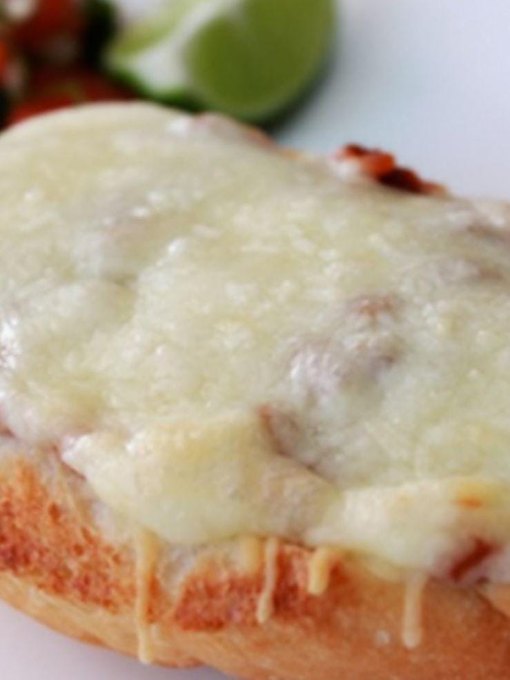 Dos panes dorados con frijoles, queso fundido y topping a elección. Acompañados con salsa de tomate