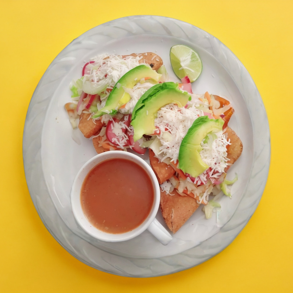 Lechuga, cebolla, limón y totopos.