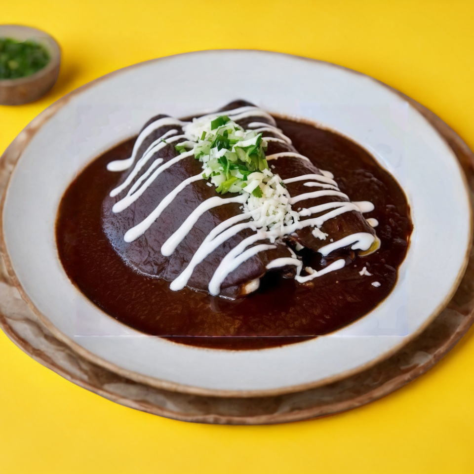 Dos tortillas rellenas de pollo bañadas de mole con crema acompañadas de arroz rojo y frijoles.