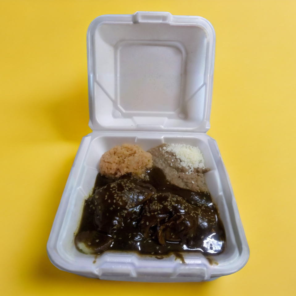 Acompañado de arroz, frijoles y tortillas.
