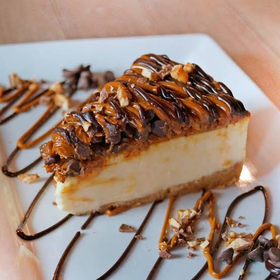 Delicioso pay de queso con chispas de chocolate, trozos de nuez y cajeta.