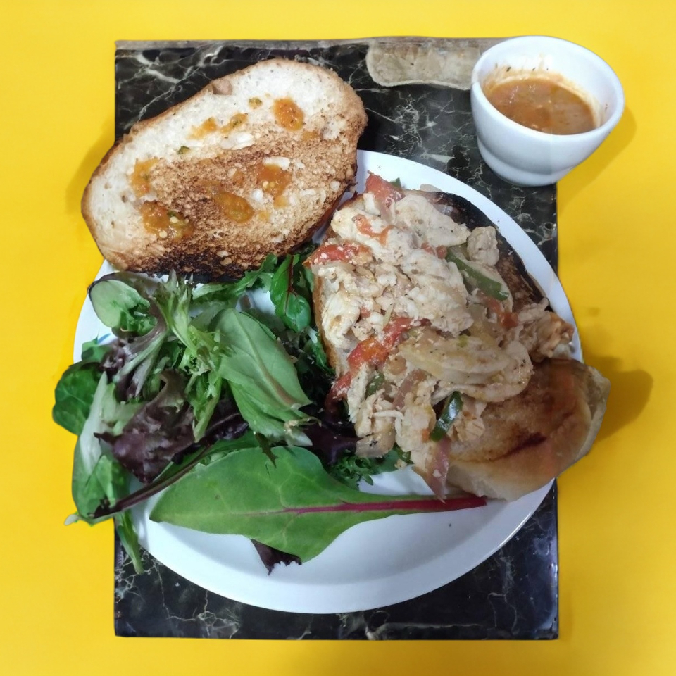 Pan dorado relleno de pollo con queso y verdura acompañado chiles