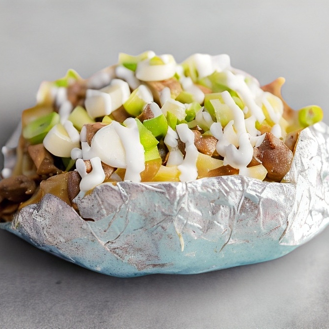 Papa al horno con mantequilla, queso, carne de tu eleccion, crema y cebolla cambray.