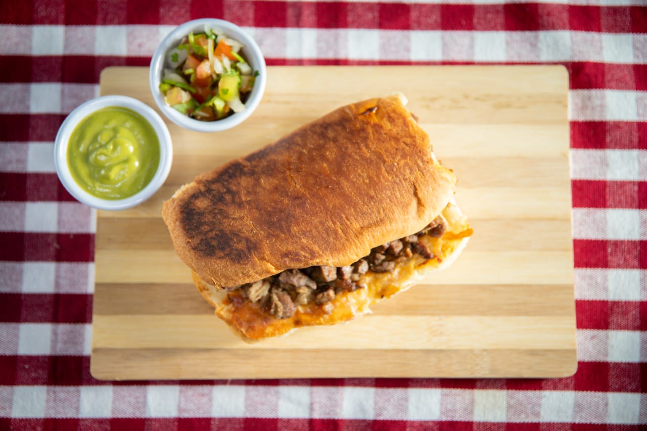 Tostada dorada a la brasa con carne de tu elección y queso Monterrey, con salsas, aguacate, frijoles y sus verduras de acompañamiento.