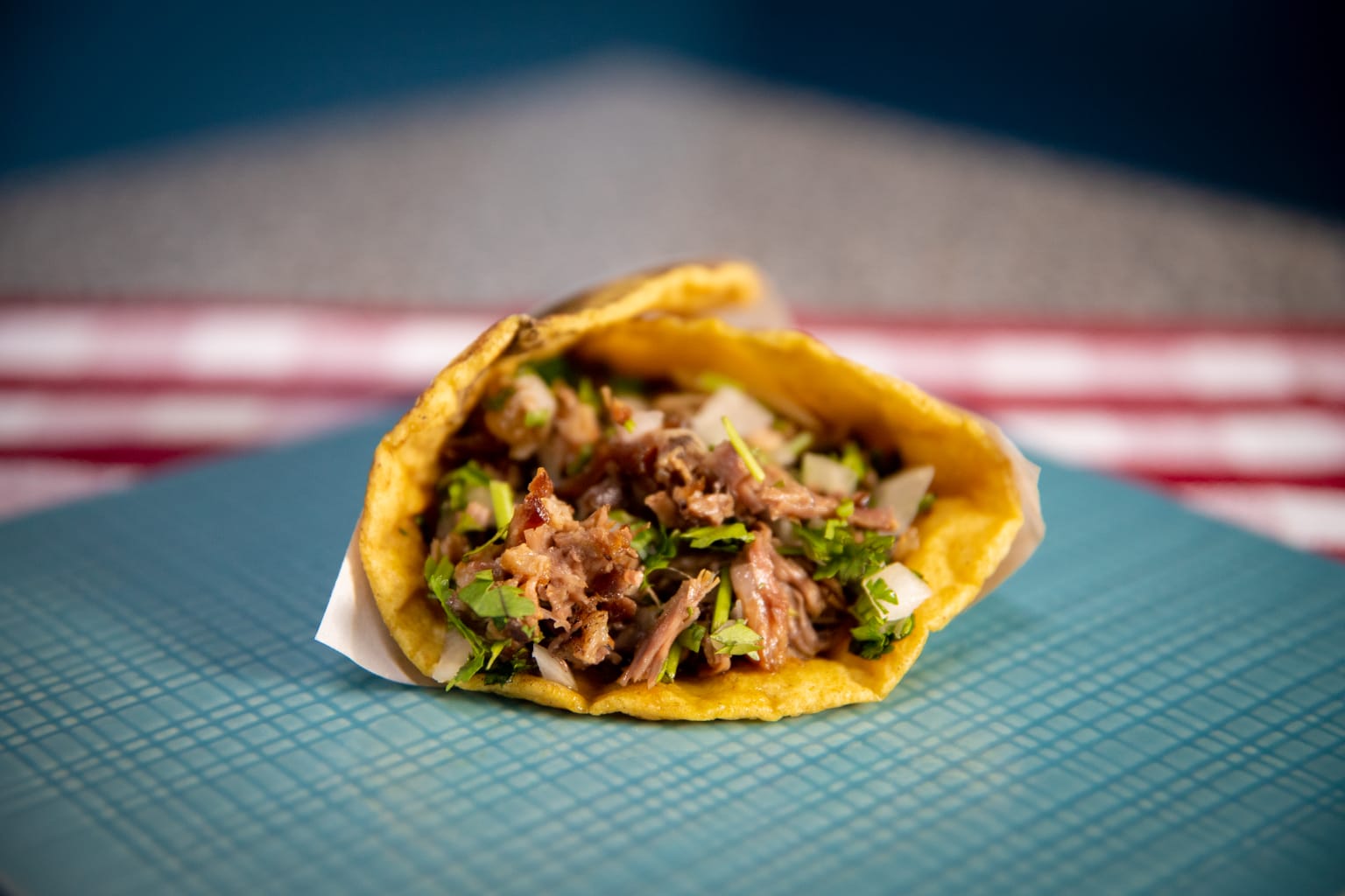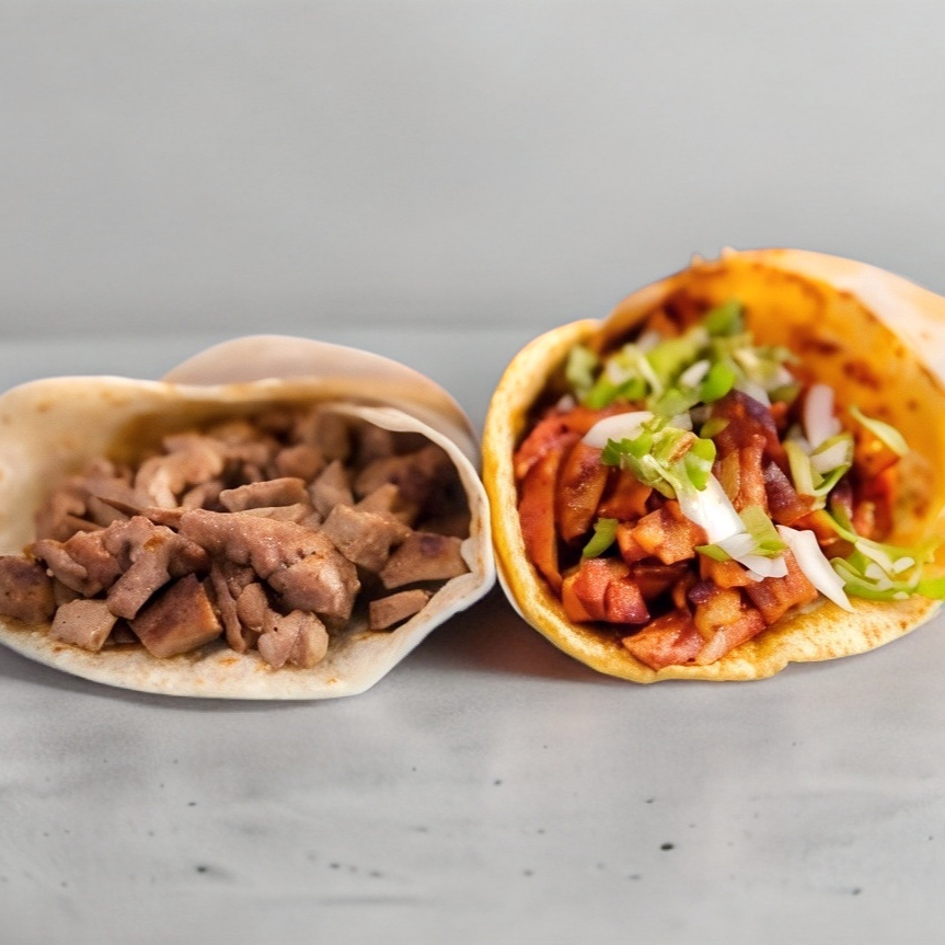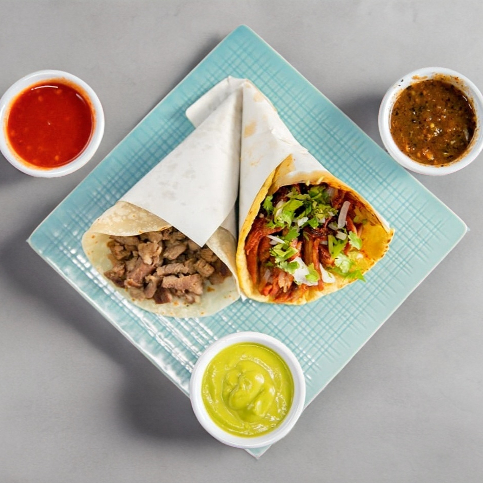Seleccion tu tortilla a gusto, rellena de carne al pastor, cebolla y cilantro.