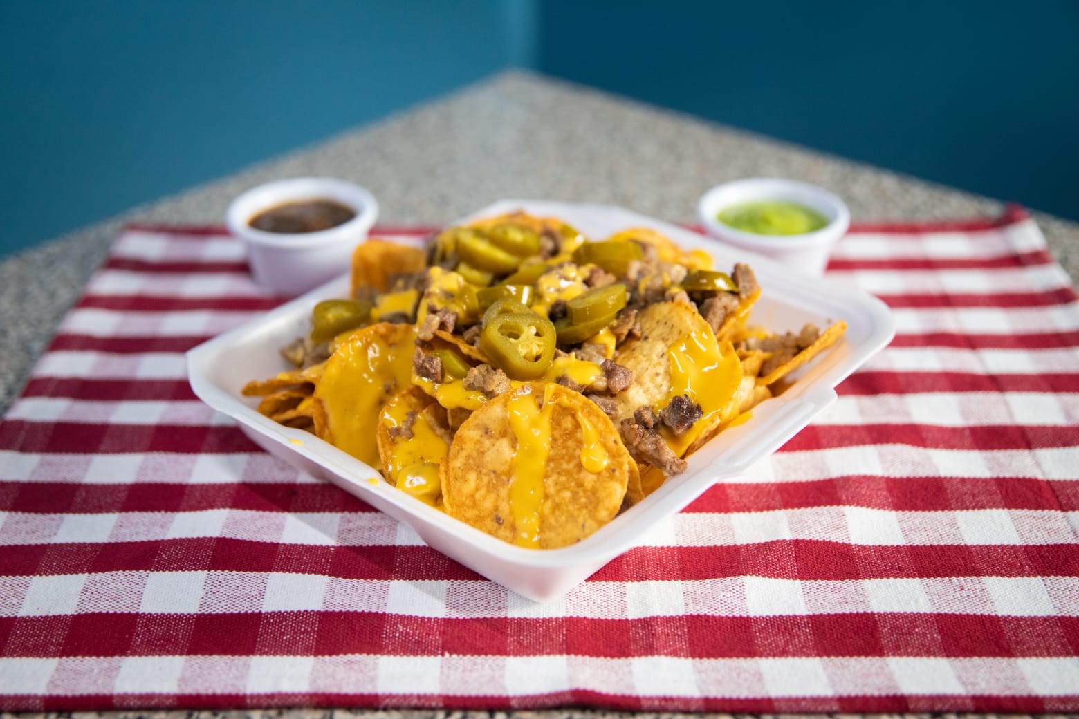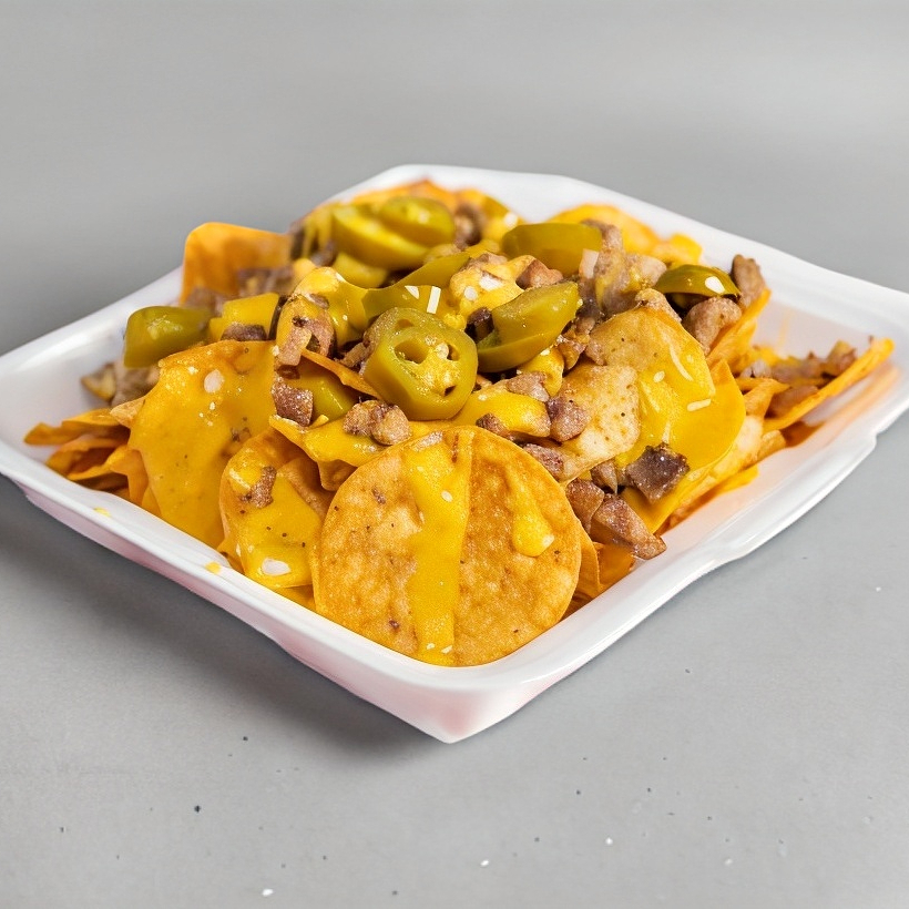 Nacho Tostito con abundante queso y carne a su eleccion, acompañados de chiles jalapeños guacamole y frijoles.