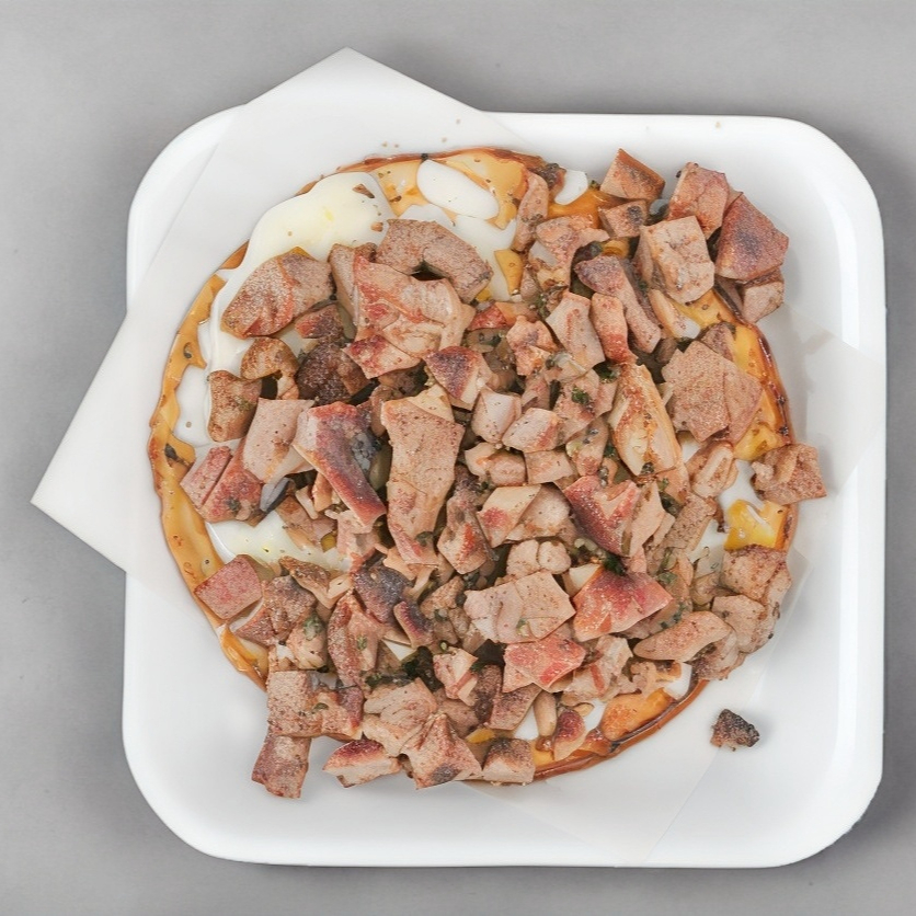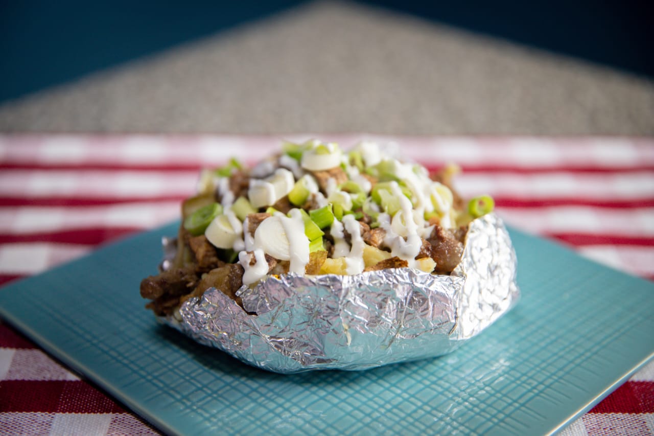 Papa al horno con mantequilla, queso, carne de pastor, crema y cebolla cambray. Por unidad