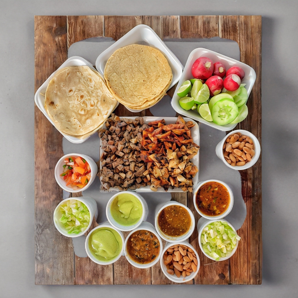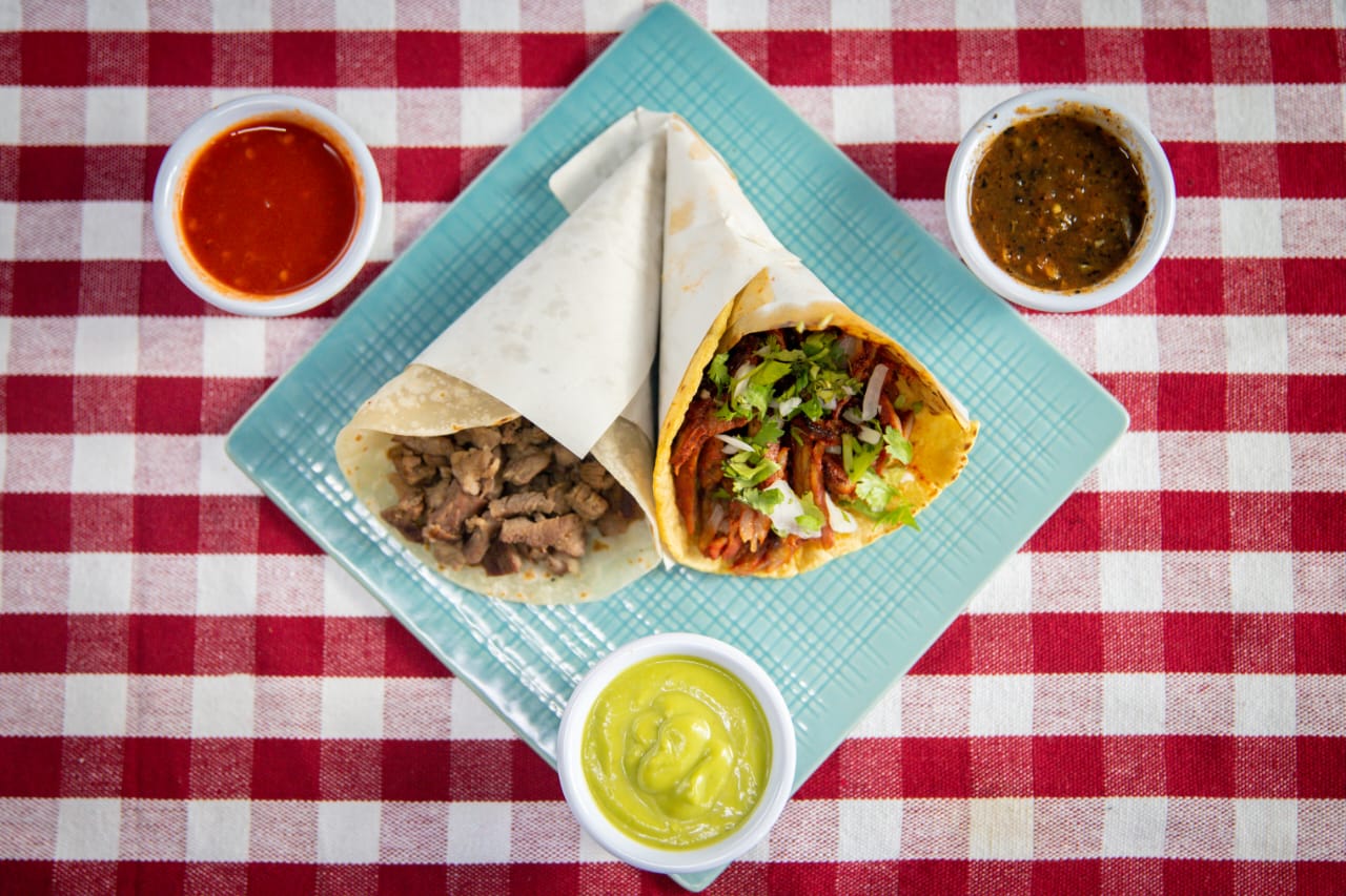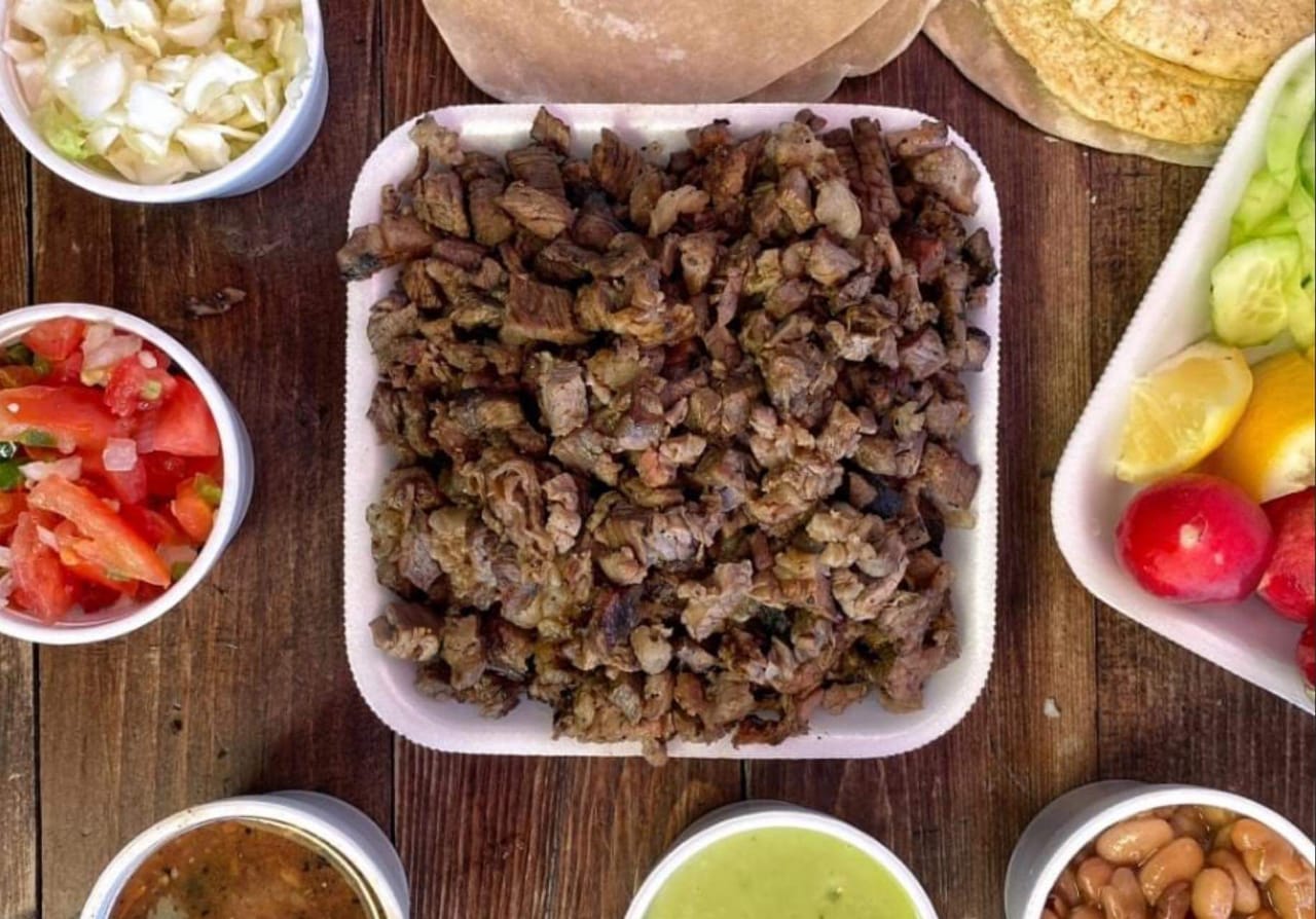 Carne asada de res, pastor o pollo y tortilla de tu elección, incluye salsas, guacamole, frijoles y todas las verduras de acompañamiento.