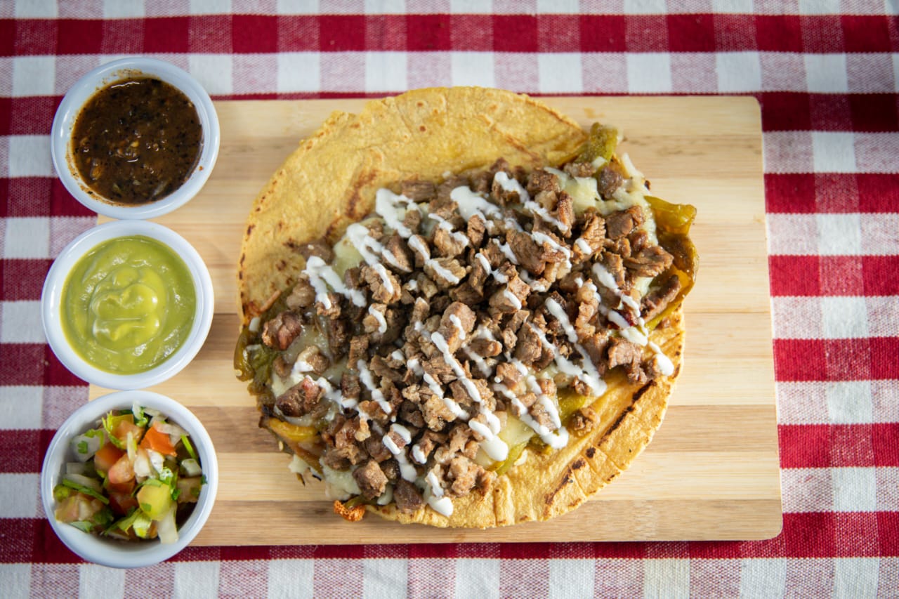 Tostada dorada de maíz servida con carne a elegir, con salsas, aguacate, frijoles y sus verduras de acompañamiento.