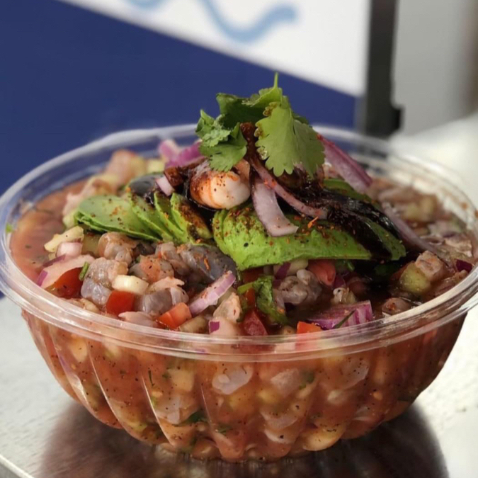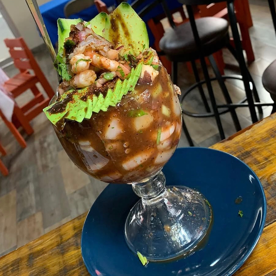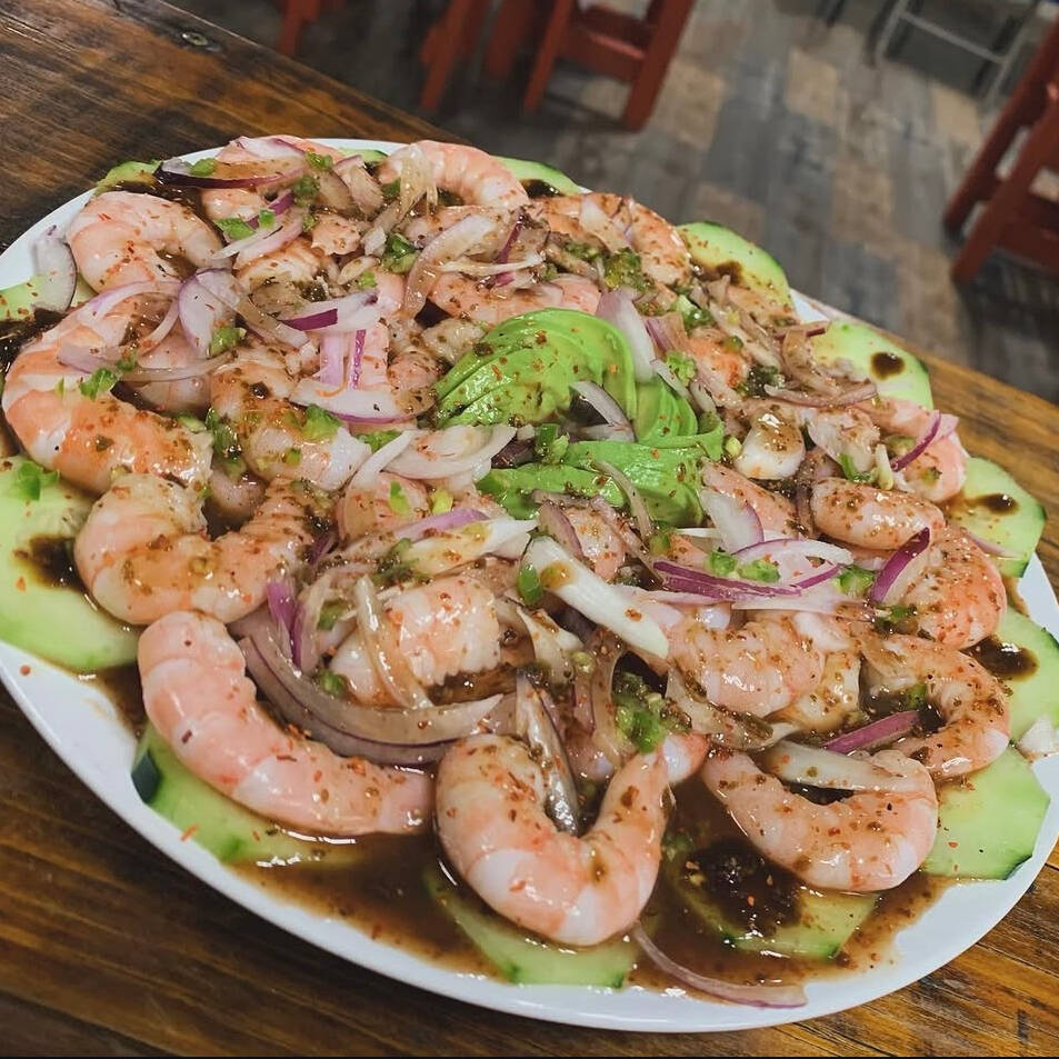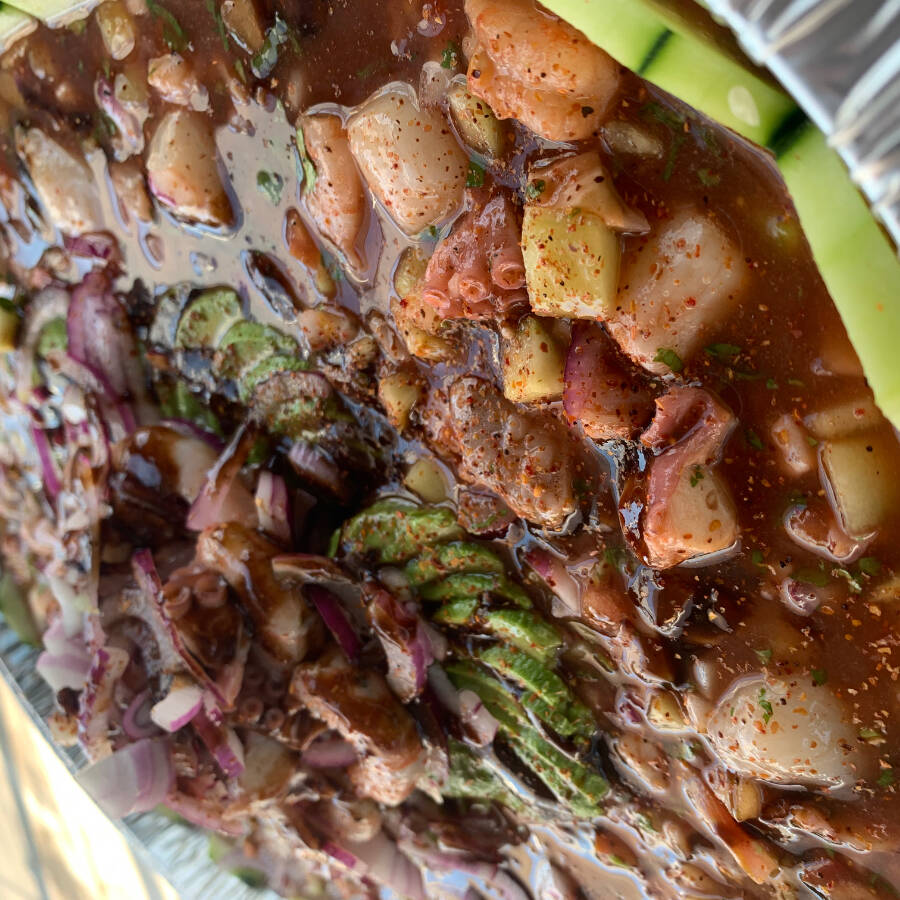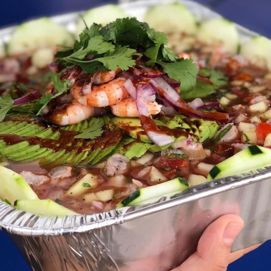 Camarón curtido, pepino, tomate, cebolla morada, cilantro, aguacate y salsas negras de la casa