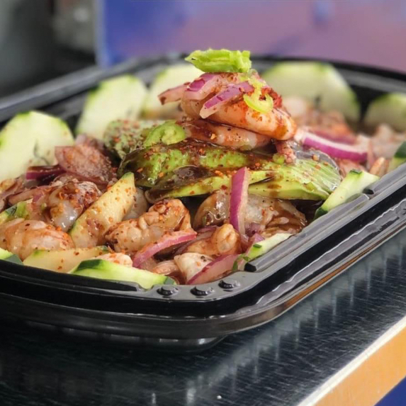Camarón cocido y curtido, medallón de atún, callo, pulpo, pepino, cebolla morada, aguacate con salseado Unico de la casa