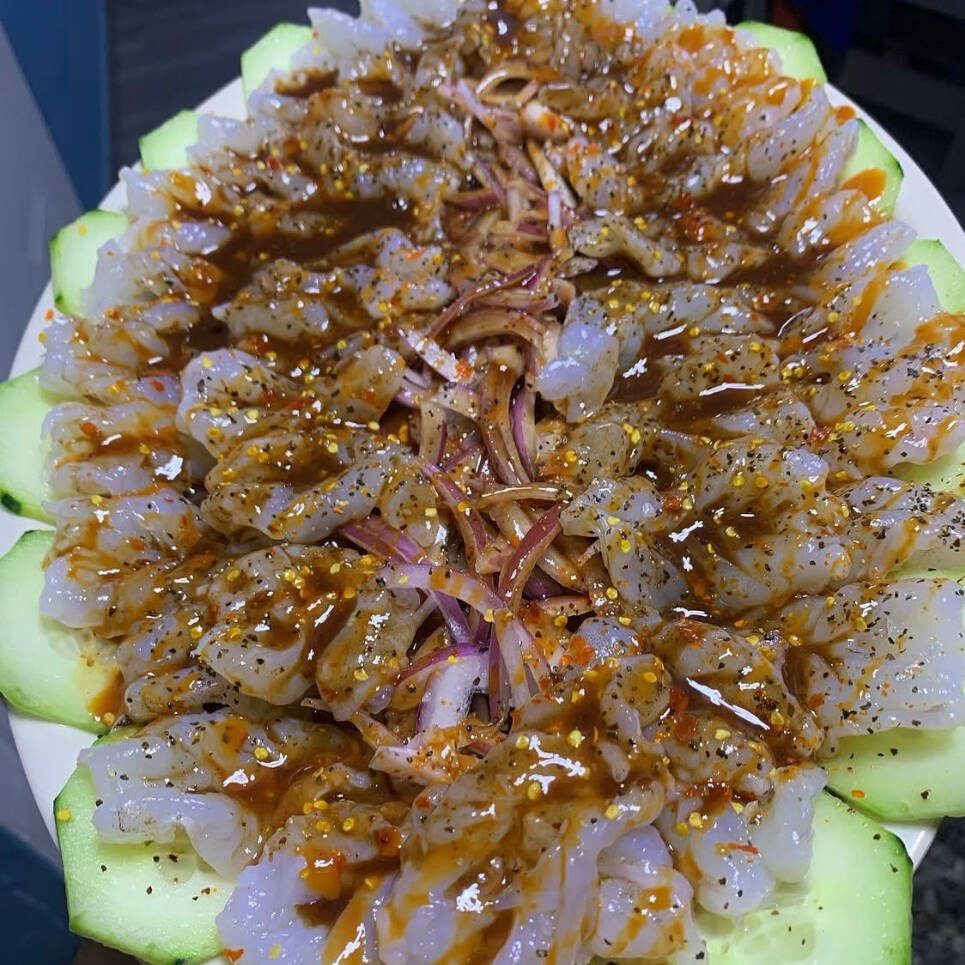 Camarón Curtido en aguachile con salsa negra de la casa