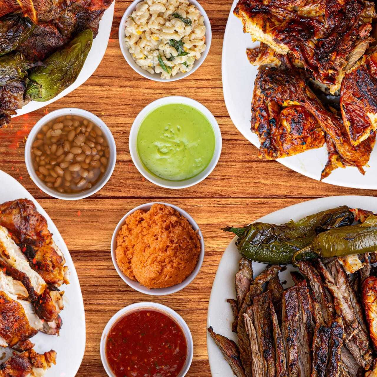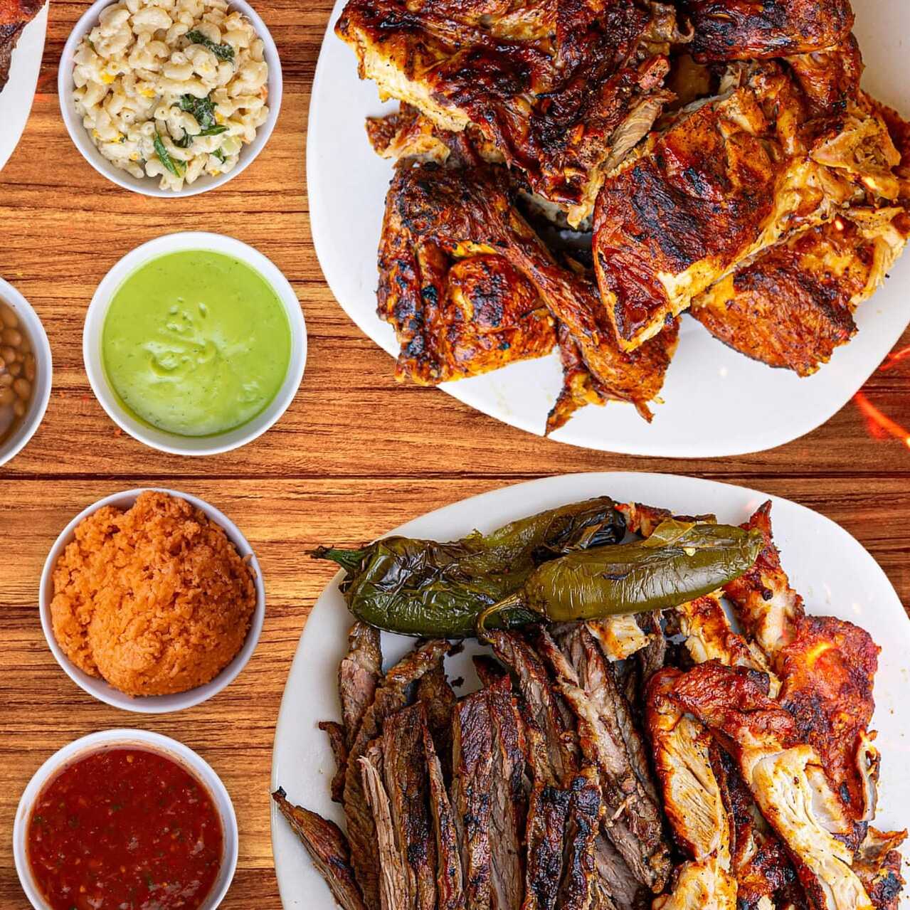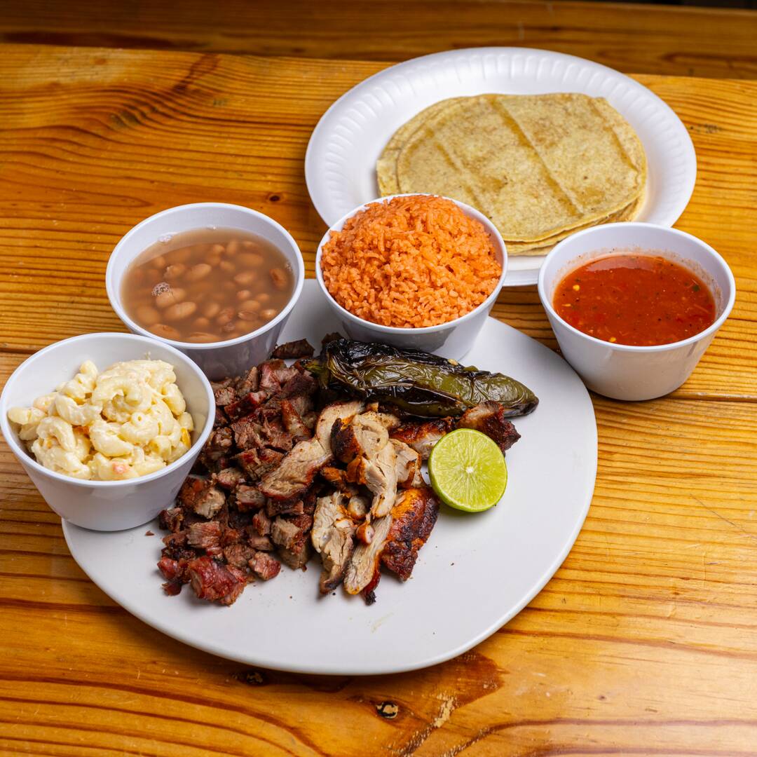 1/2 COSTILLA 1/2 POLLO DESHUESADO GUACAMOLE FRIJOLES SALSAS TORTILLAS CHILES CEBOLLITAS ASADAS Y REPOLLO
