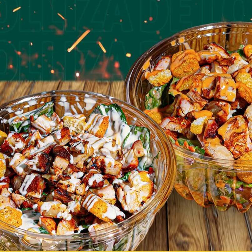 MIX DE LECHUGAS COL MORADA TOMATE ELOTE EN GRANO CRUTONES POLLO A LA PLANCHA Y ADEREZO RANCH Y GALLETAS SALADAS