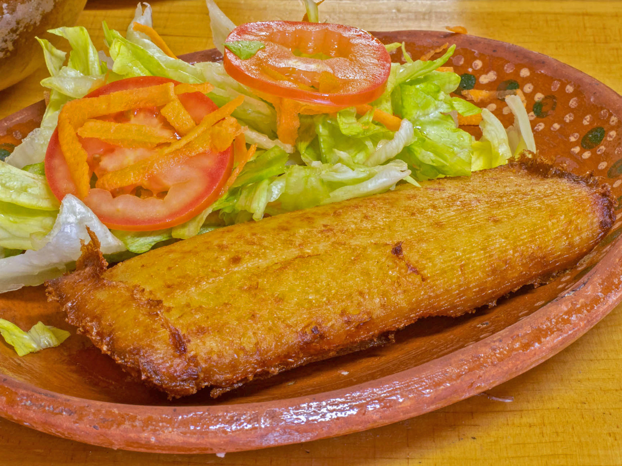 Dos tamales de carne, fritos o naturales acompañados de frijol con queso.