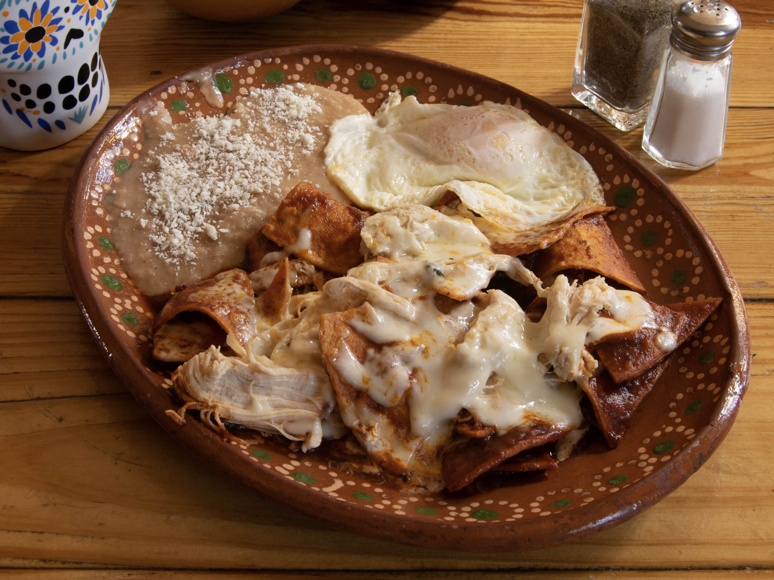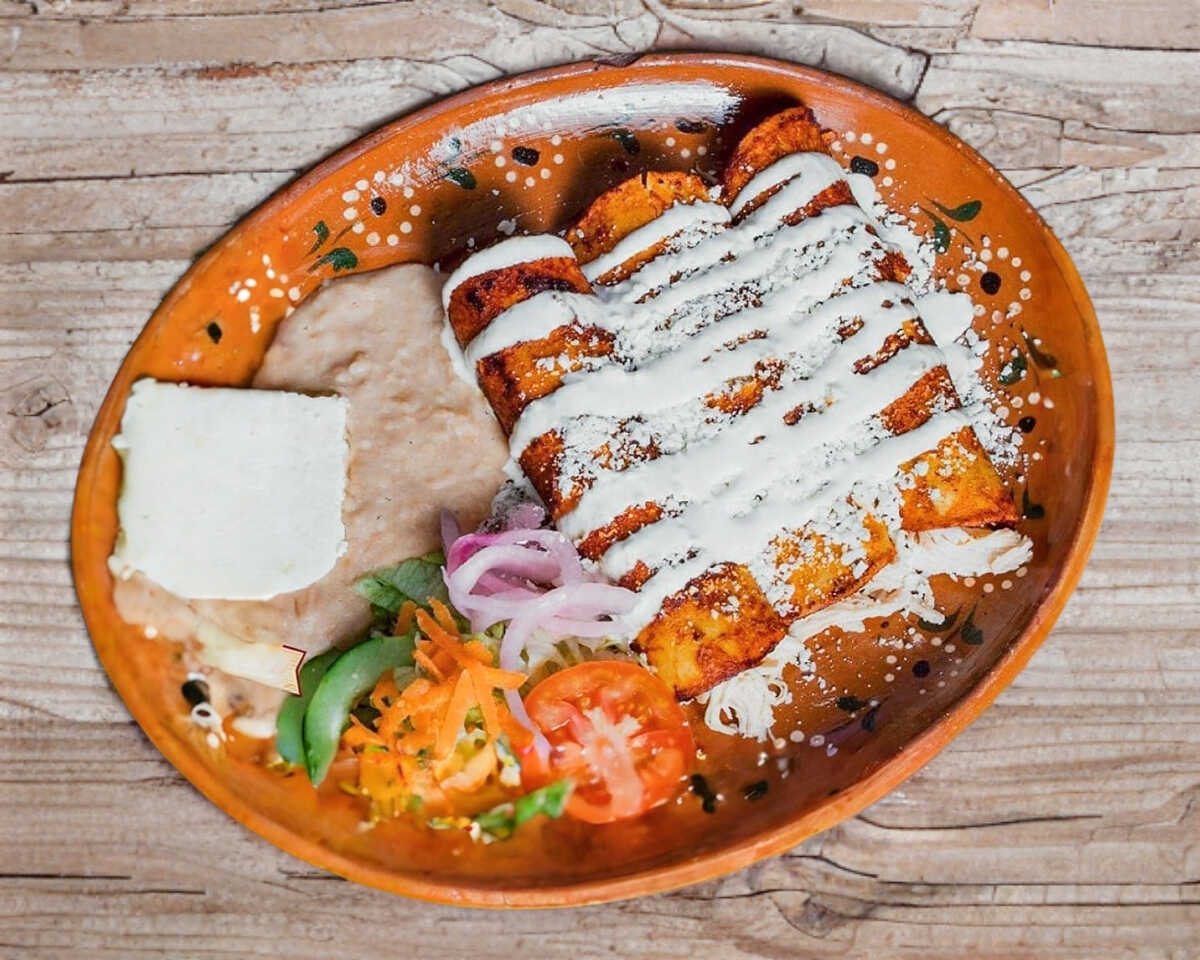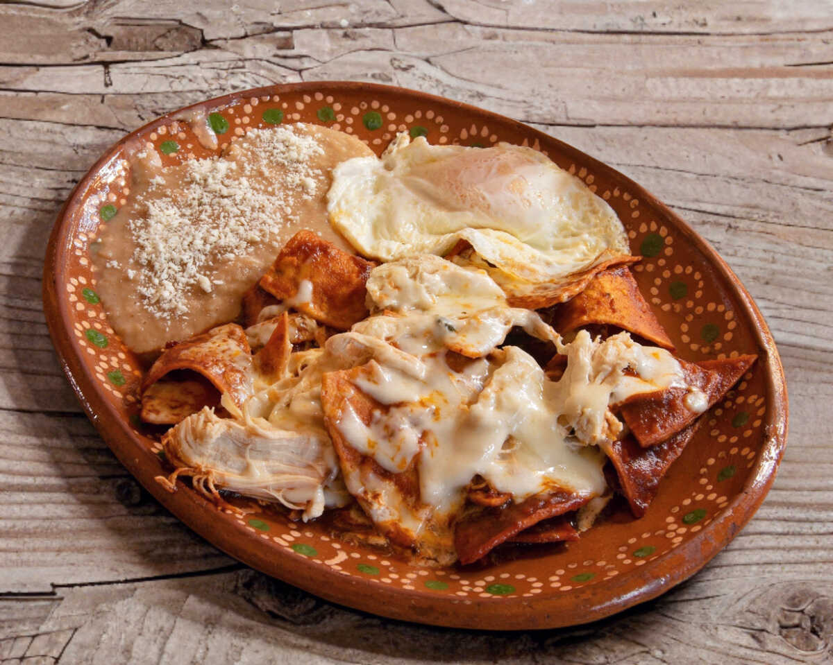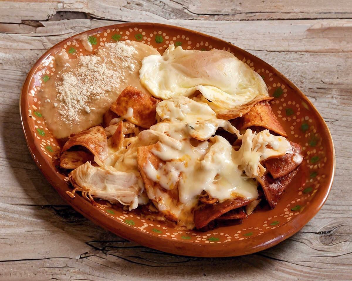 Tortillas doraditas guisadas en salsa roja, coronadas con pollo, acompañada de arroz y frijoles con queso.