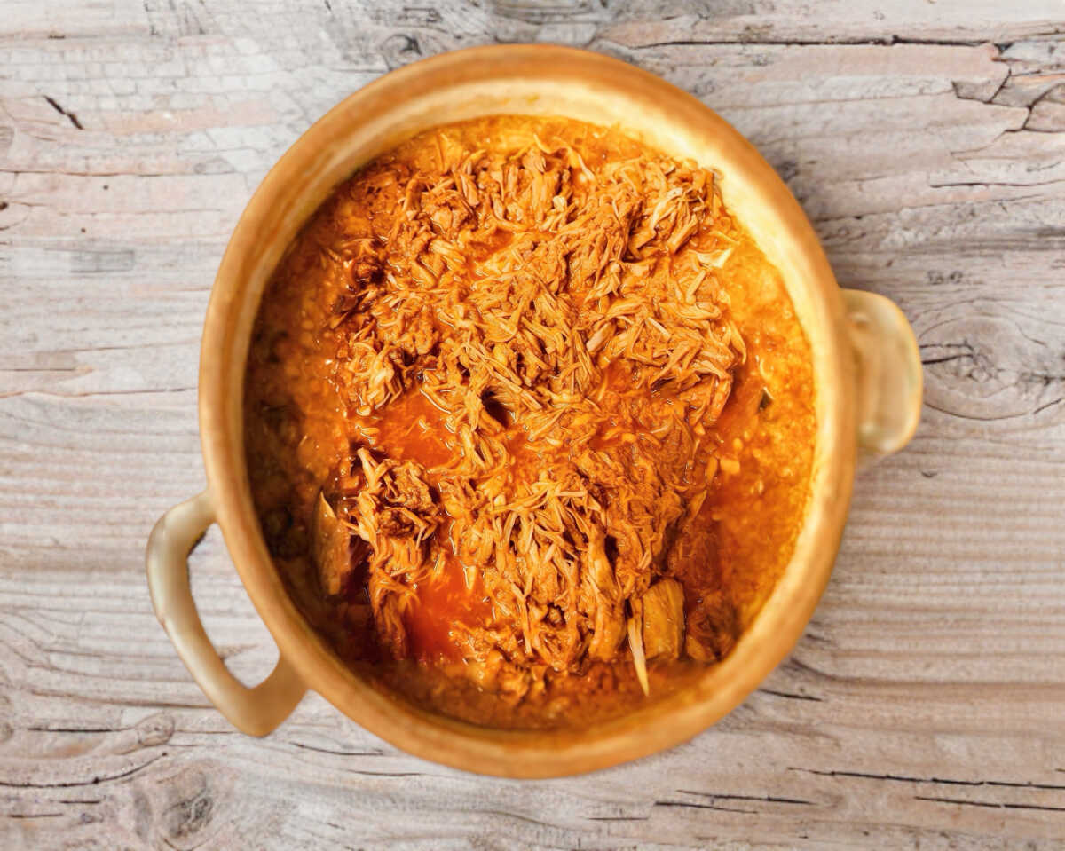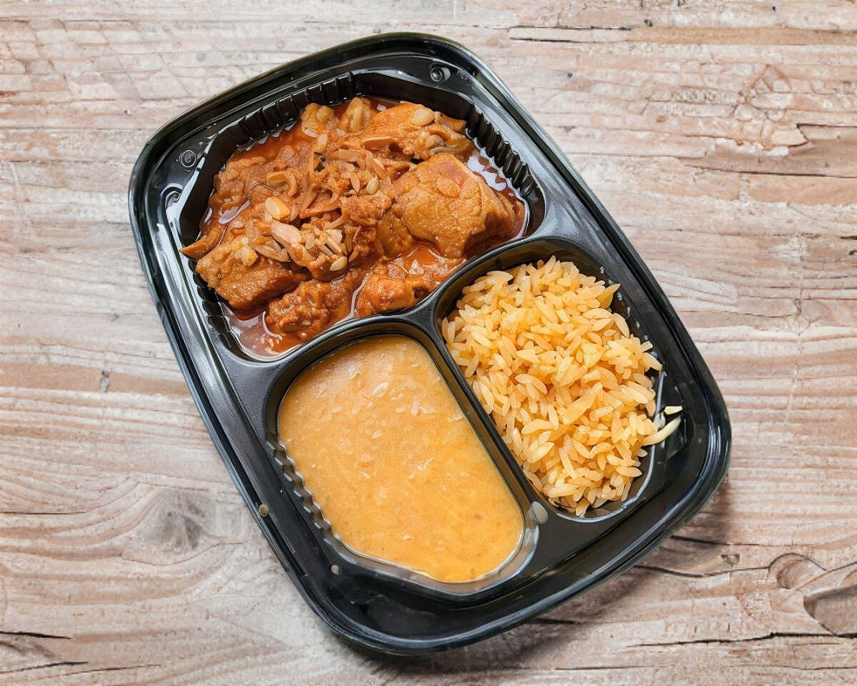 Barbacoa de puerco con papa. Acompañado de arroz rojo, frijoles puercos o sopa fría.