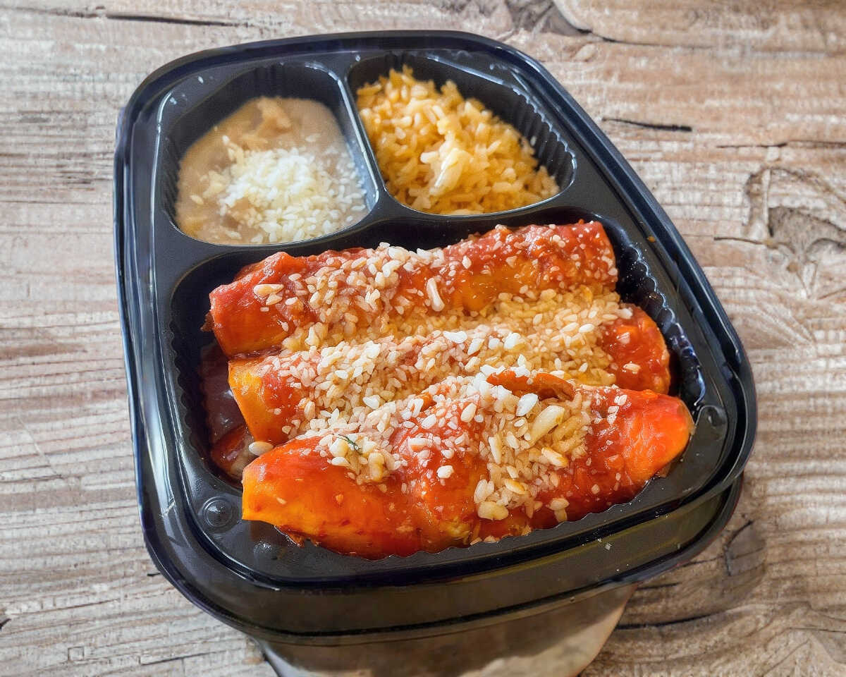 3 Enchiladas de pollo bañadas de salsita roja de la casa, cubiertas de queso cotija y crema; acompañadas de ensalada fresca, frijoles con queso y arroz rojo