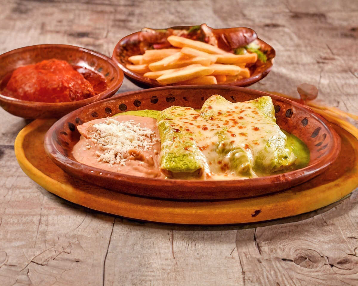 Tres enchiladas bañadas en nuestra deliciosa salsita verde, cubiertas con queso gratinado, acompañadas de frijoles con queso y arroz rojo.