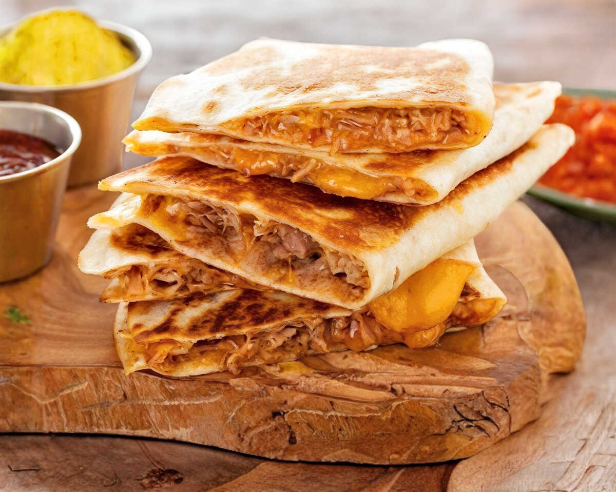 Dos quesadillas de maíz o de harina rellenas, una de chilorio y otra de machaca sinaloense, acompañado de salsa bandera y frijol con queso.