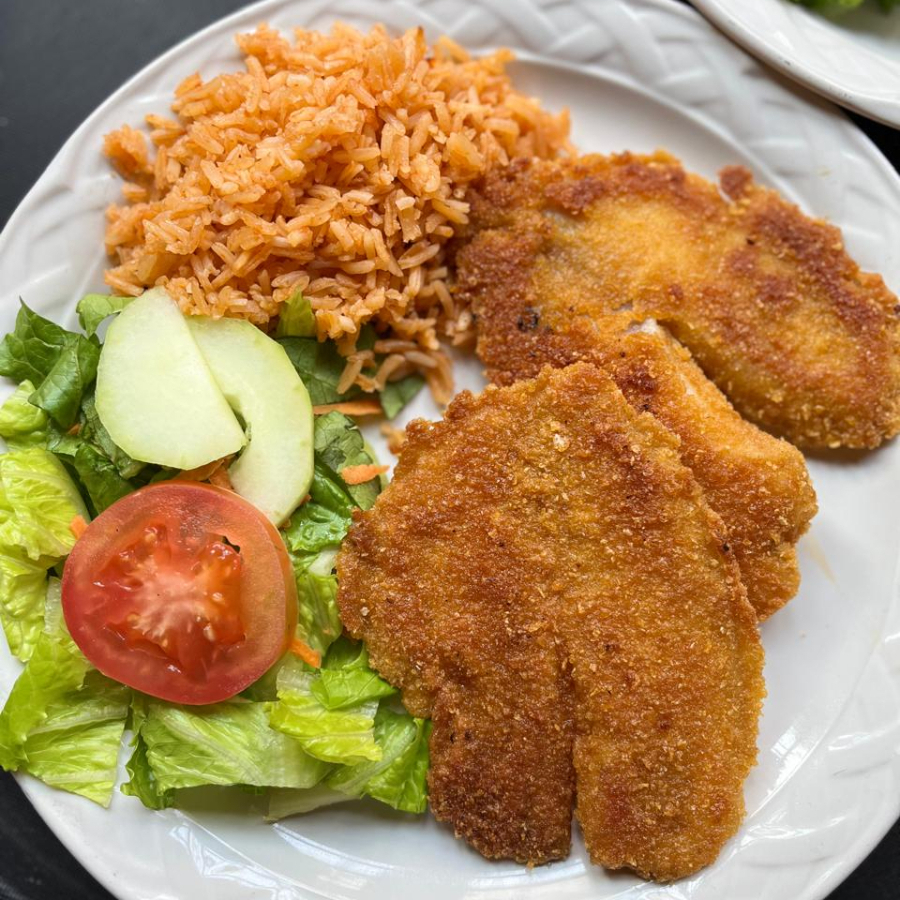 200gr de pechuga sazonada a la plancha, acompañada delicioso arroz rojo y frijolitos refritos.