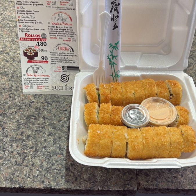 SURIMI, POLLO, CARNE, QUESO MONTERREY, PEPINO, AGUACATE , EMPANIZADO EN PANKOO, APROX 20 TOZOS