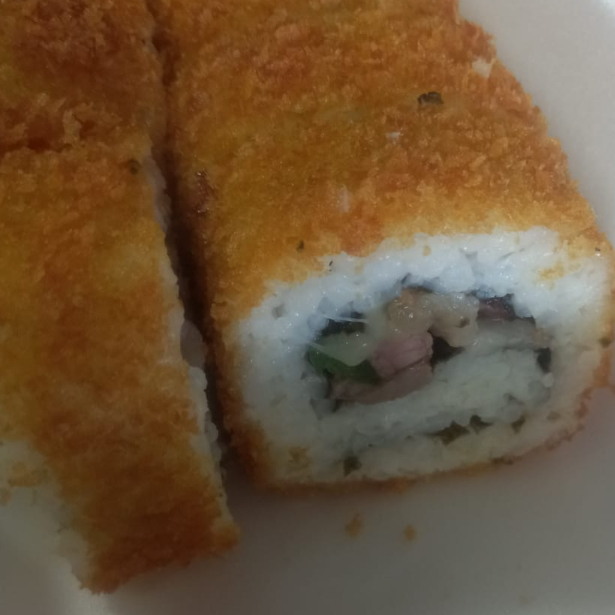 1 ROLLO DE SURIMI POLLO CARNE QUESO AGUACATE PERINO EMPANIZADO CON PANCO ACOMPAÑADO DE TERIYAKI DE POLLO CON ARROZ BLANCO