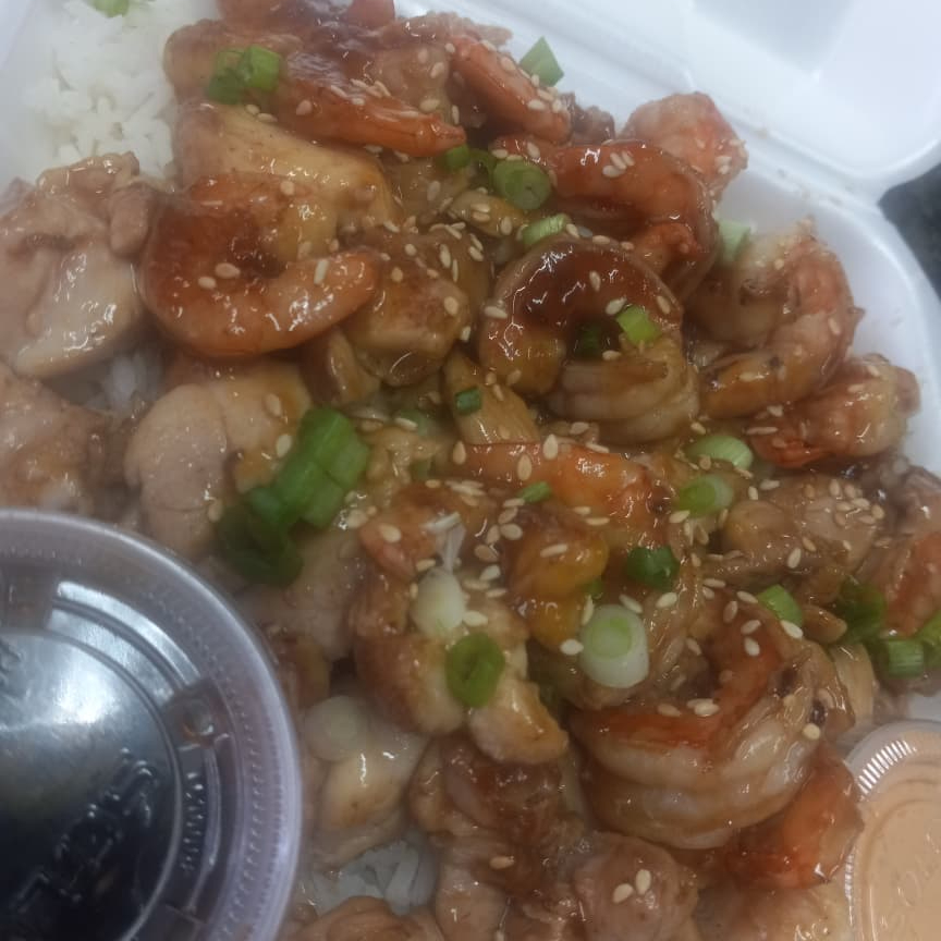 CAMA DE ARROZ BLANCO CON POLLO Y CAMARON EN SALSA TERIYAKI SIN VERDURAS