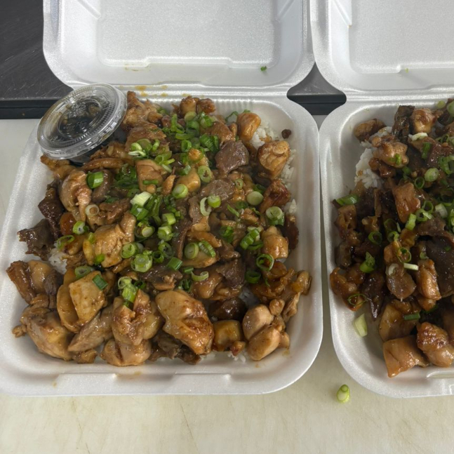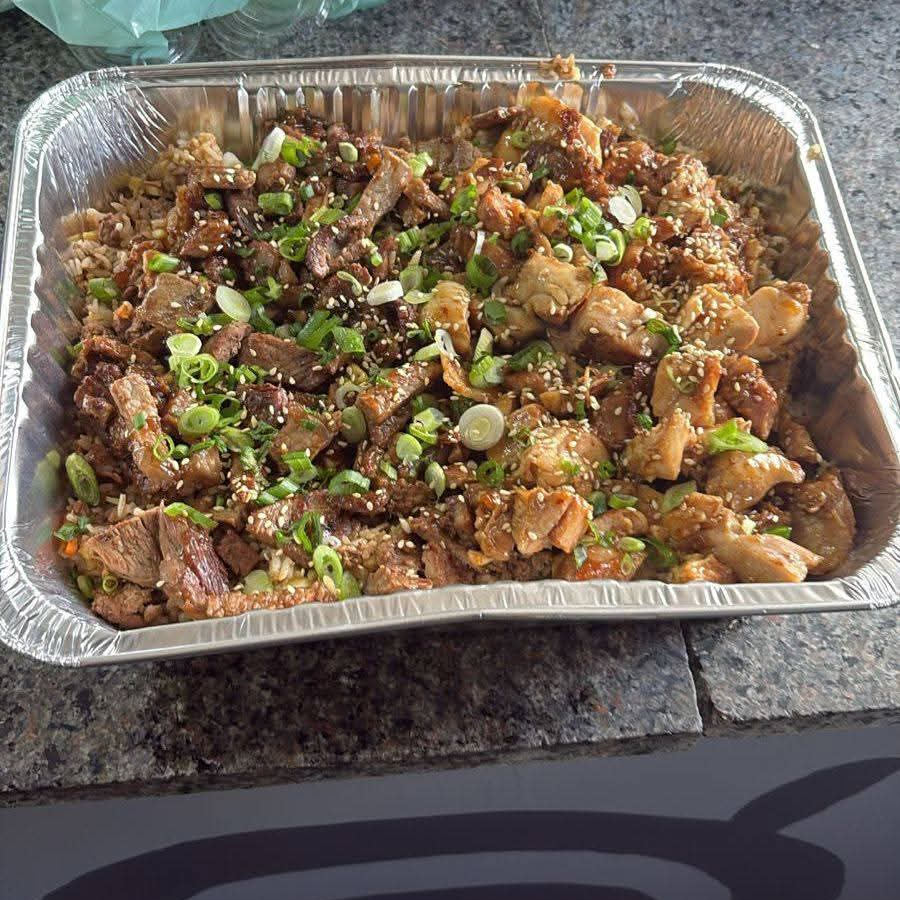 CAMA DE ARROZ CON POLLO Y CARNE EN SALSA TERIYAKI SON VERDURAS