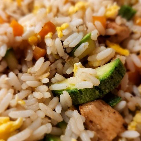 ARROZ FRITO CON SALSA DE SOYA, VINAGRE DE ARROZ, CON UNA PEQUEÑA PORCION DE CALABAZA, ZANAHORIA. CEBOLLIN, HUEVO Y PROTEINA A ELEGIR