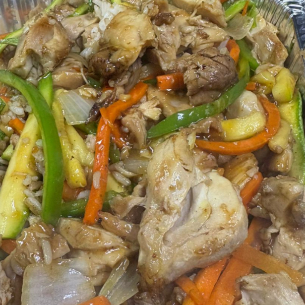 CHAROLA CAMA DE ARROZ BLANCO CON POLLO EN SALSA NTERIYAKI SIN VERDURAS (APARTE)