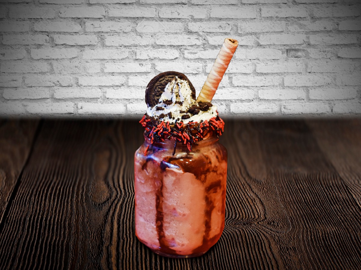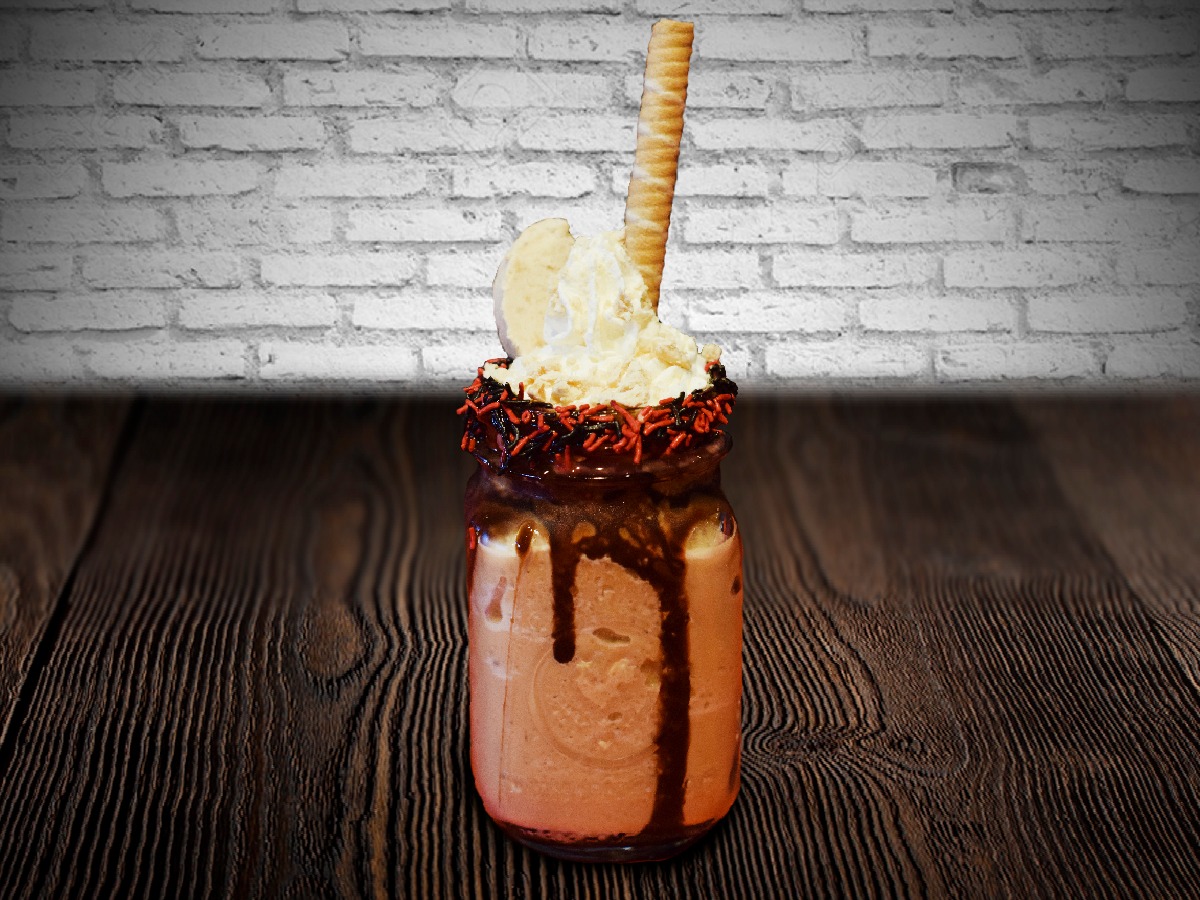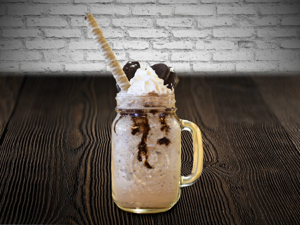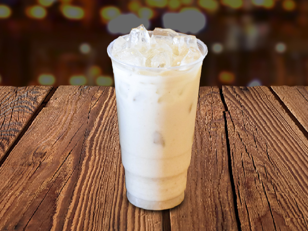 Frappé sabor mazapán,decorado con nieve y crema pastelera. 16 onz