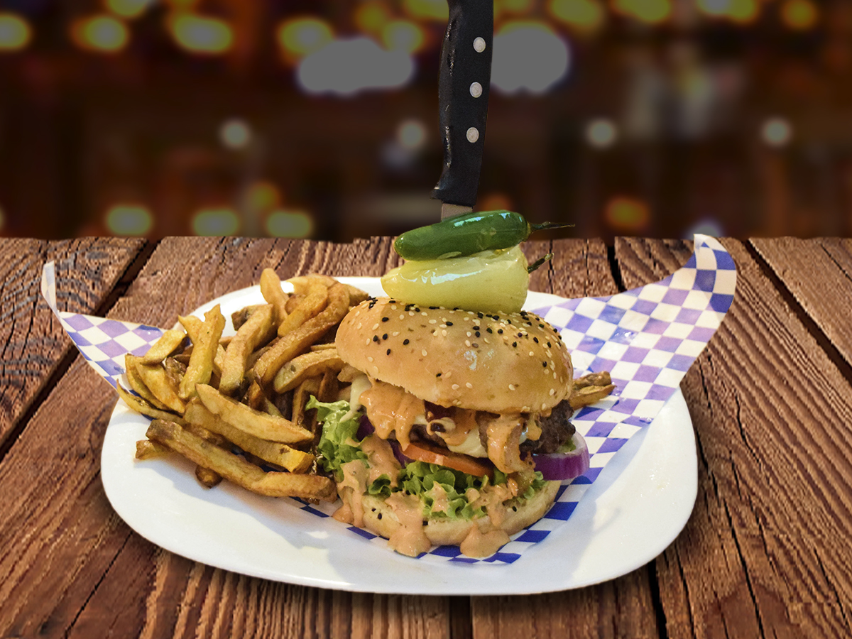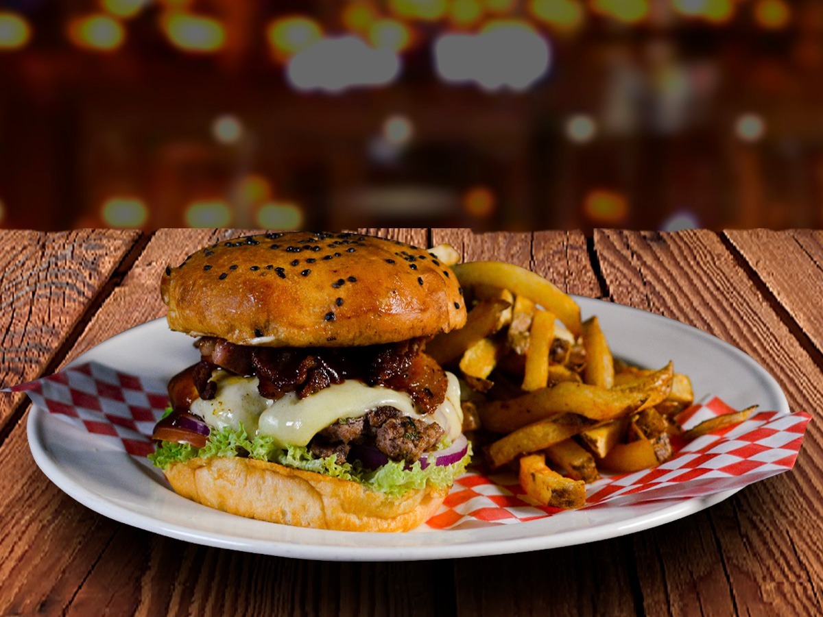 Combinación que nunca falta 200 gramos de jugosa carne de res con salsa bbq y tocino, 100% western, incluye una porción grande de papas fritas o ensalada.