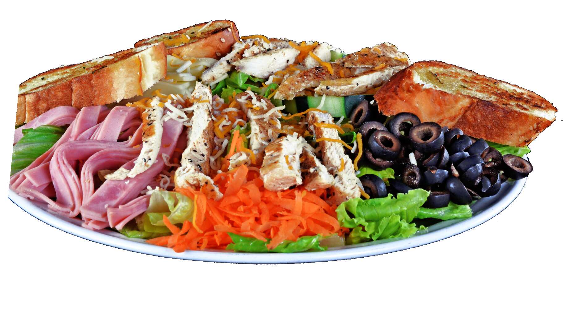 Lechuga fresca, espinacas, tomate, cebolla, pepino en rodajas, aceituna negra, jamón de pavo, queso cheddar, queso monterrey y pechuga de pollo a la plancha, se sirve con pan de ajo.
