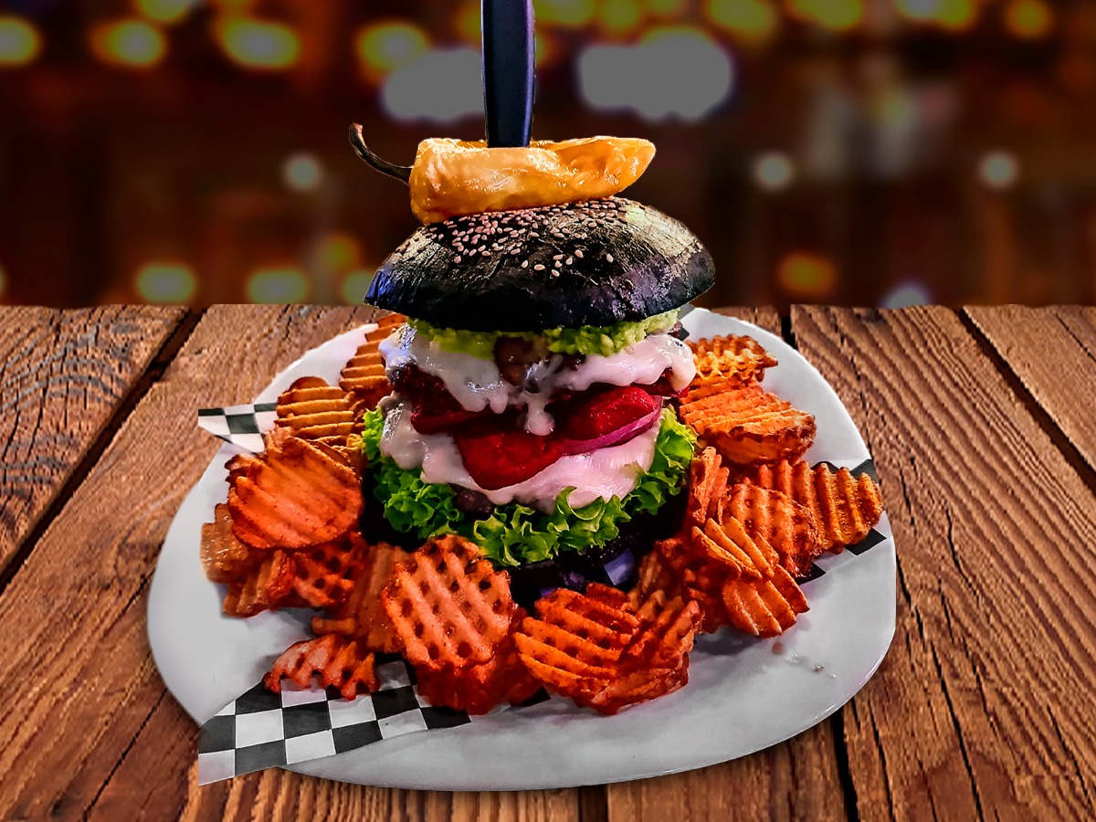 Pan brioche negro, carne receta de la casa, queso suizo, bubas, tocino, verdura fresca, chile toreado, guacamole y papas naturales onduladas o ensalada a elegir.