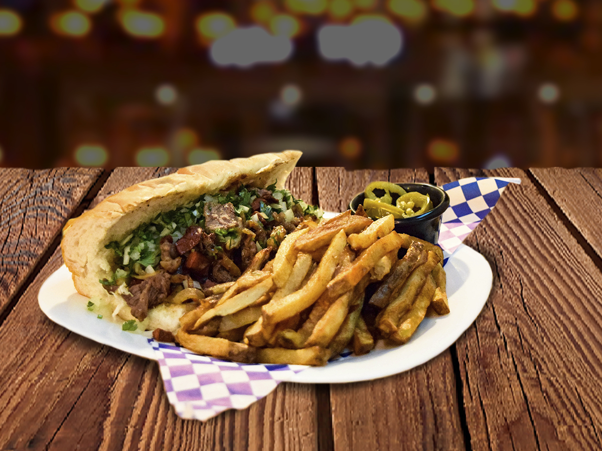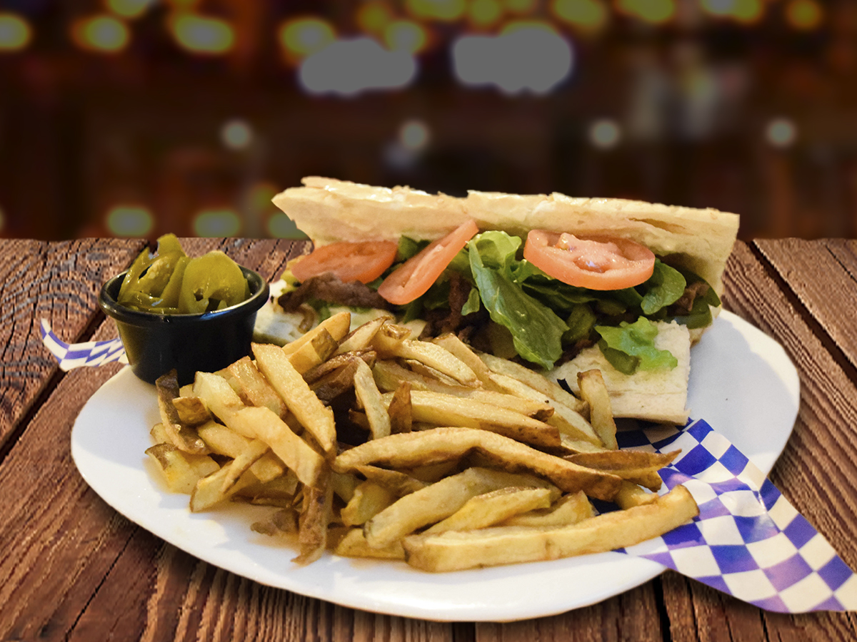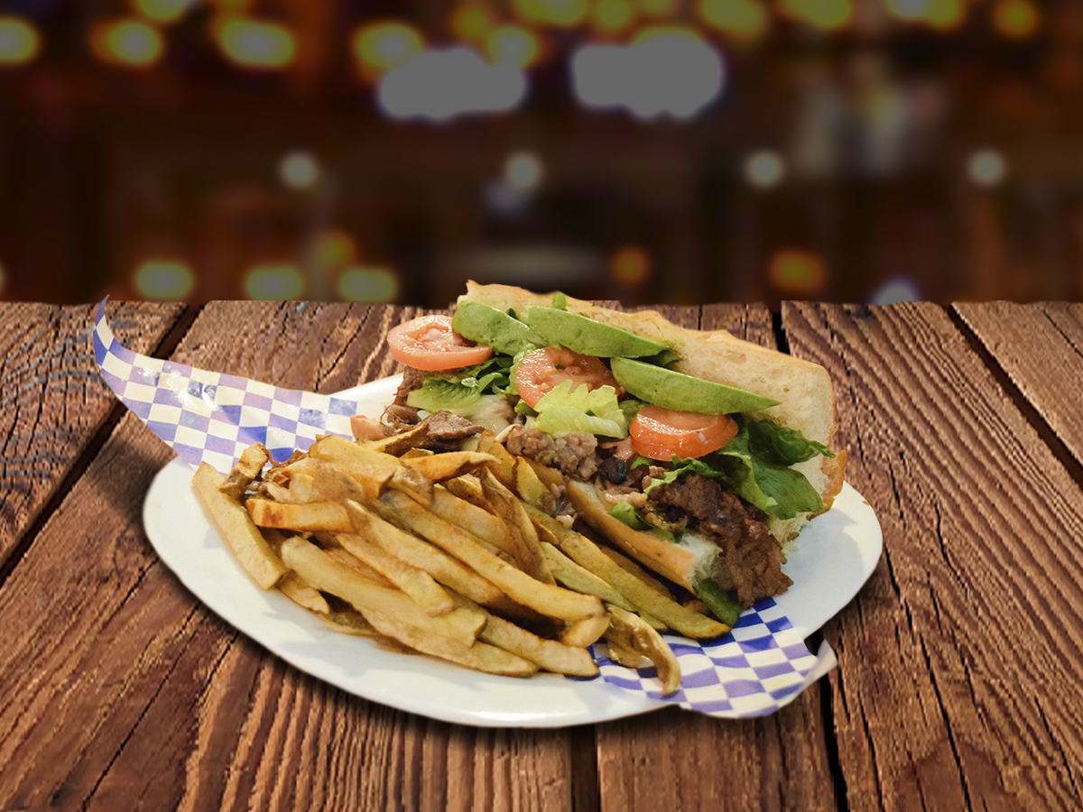 Nuestra marca de la casa, deliciosa carne a la plancha con cebolla, pimientos, champiñones y queso suizo.
