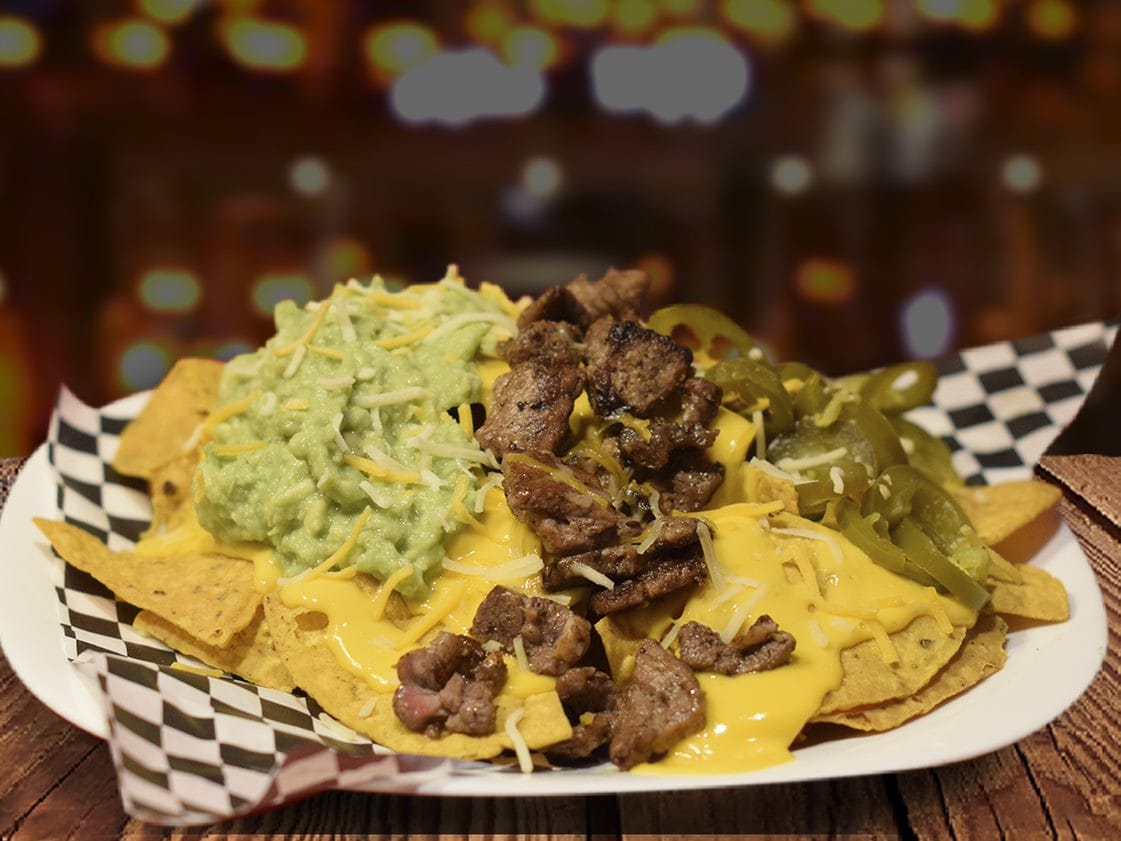 Nachos con delicioso queso cheddar, carne a la planche y nuestro ya tradicional guacamole.