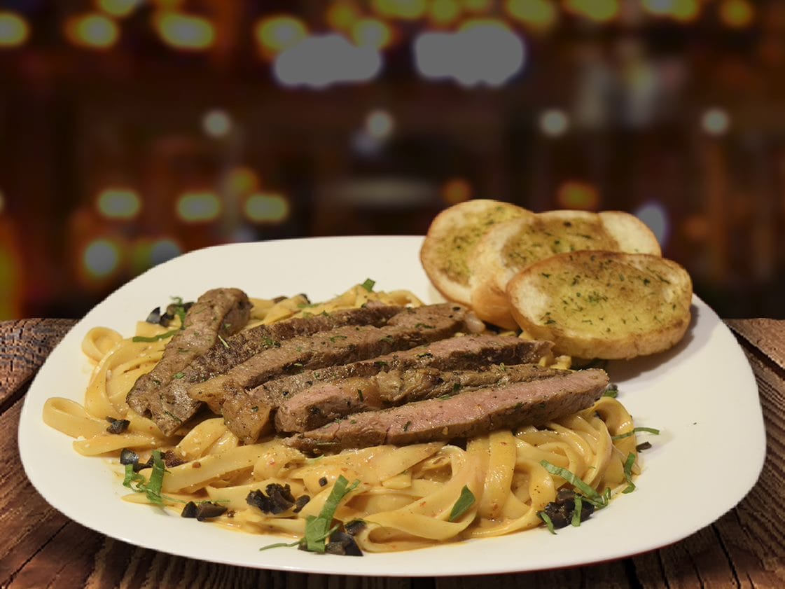 Deliciosa pasta fetuccini salteada a la mantequila, servido con queso parmesano, champiñones y cebolla, se sirve con pan de ajo.