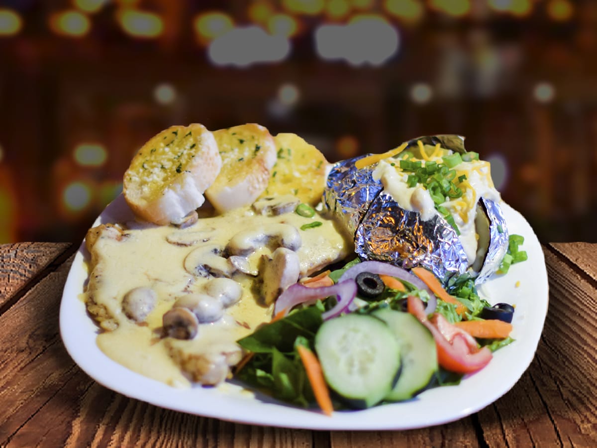 Jugosa pechuga de pollo, acompañada de fresca ensalada, incluyen papas al horno, ensalada y pan de ajo.