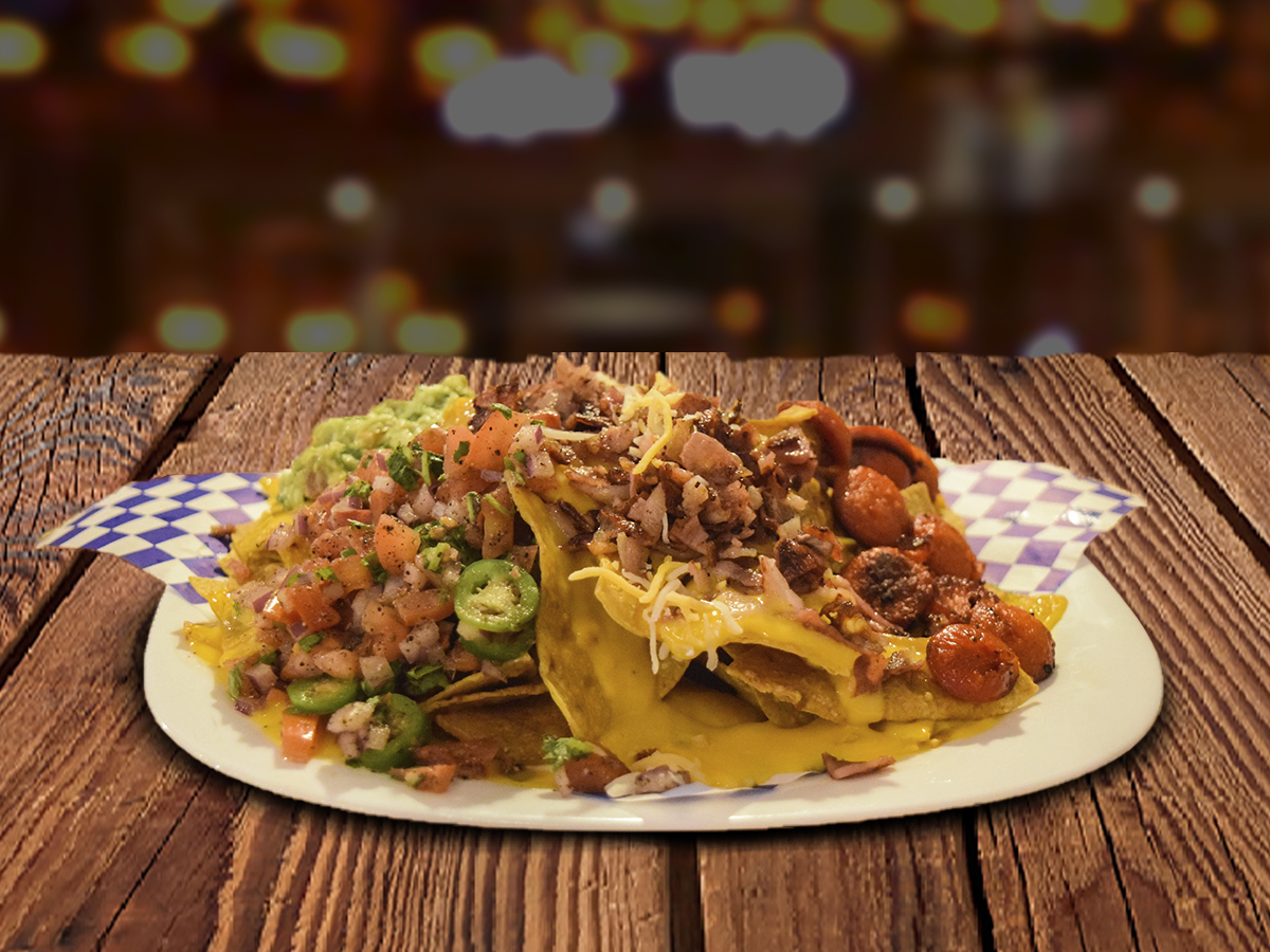 Bañados con queso cheddar, deliosas bubas, tocino, salsa bandera, jalapeños y guacamole de la casa.