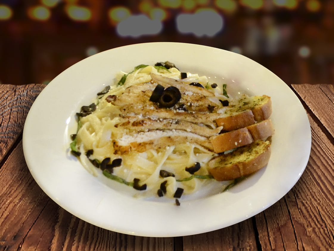 Fettuccini servido con la deliciosa crema Alfredo hecha en casa, no existe otro mejor, se sirve con pan de ajo.