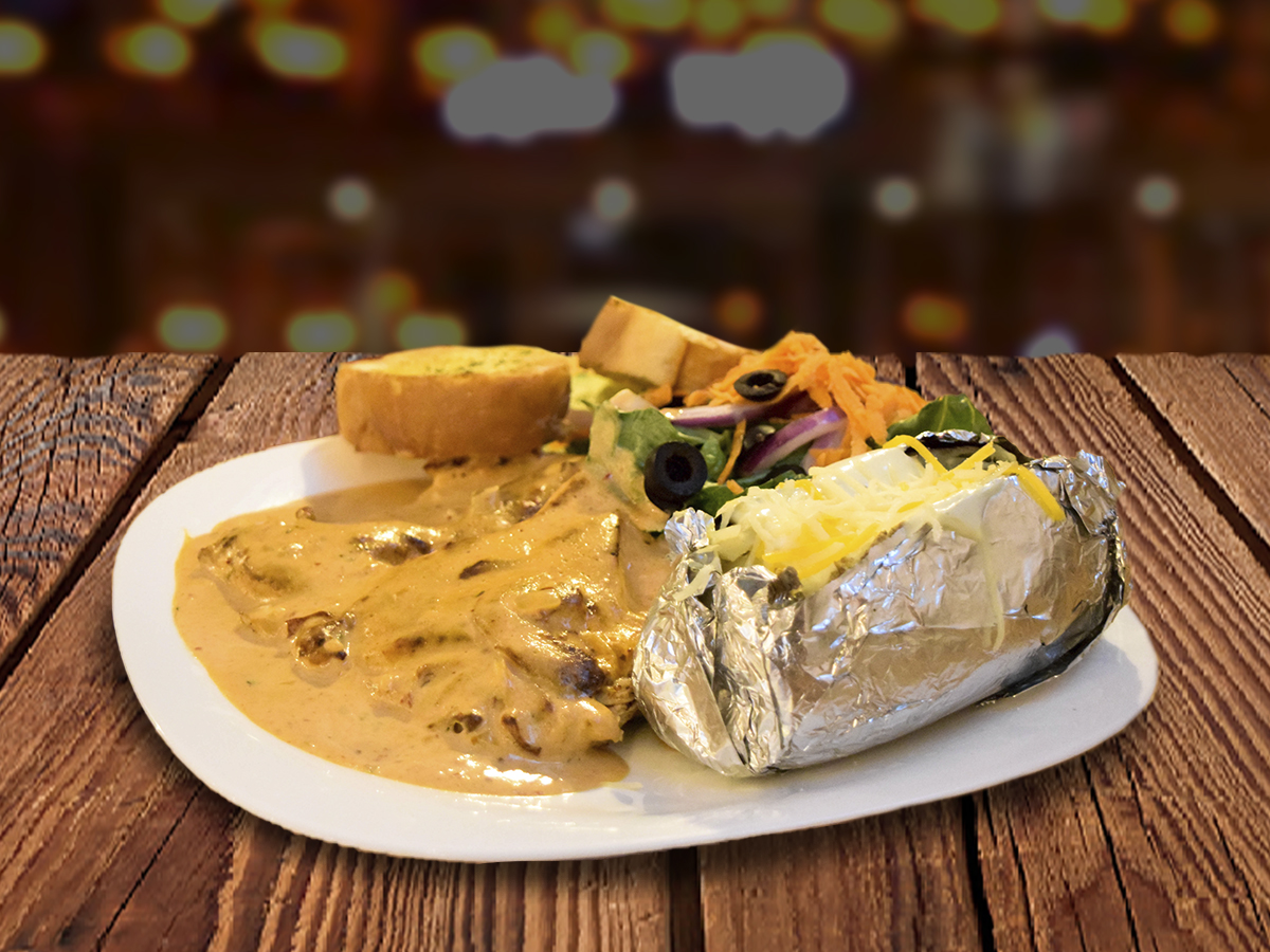 Tierna pechuga de pollo, aderezada con picosita crema de chipotle, como hecha en casa, incluye papa al horno, ensalada y pan de ajo.
