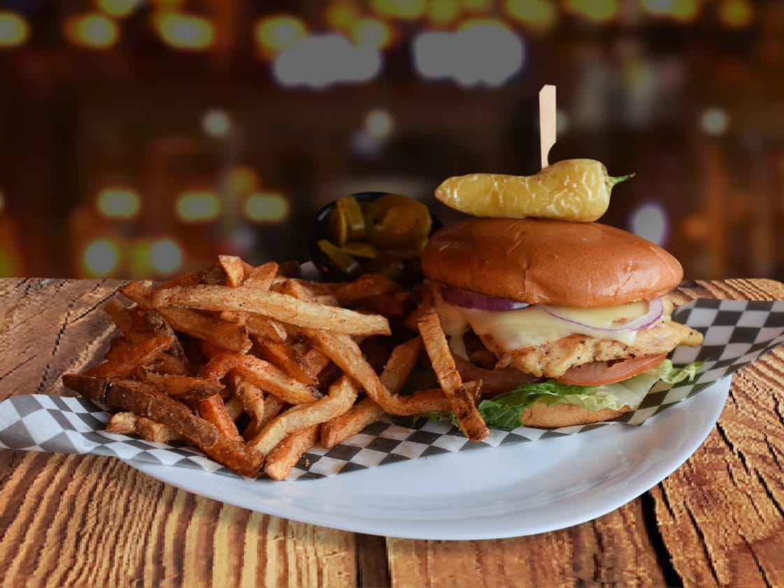 200 gramos de pechuga de pollo, con queso suizo, tocino, lechuga, tomate, cebolla morada, chile güerito toreado y papa naturales o ensalada.